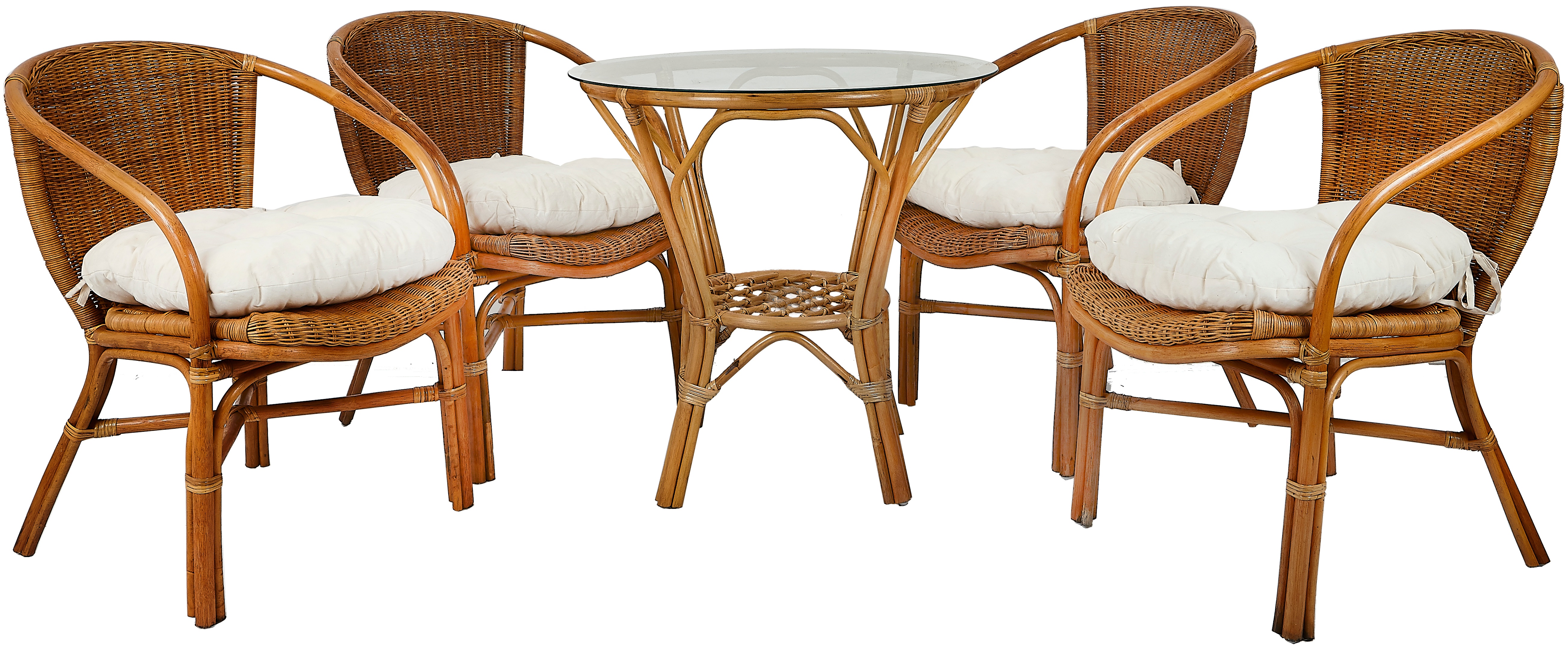 Kolekce obsahuje 4 ratanová křesla a ratanový stolek se skleněnou deskou. Stolek má ve spodní části plochu na ukládání drobných věcí.