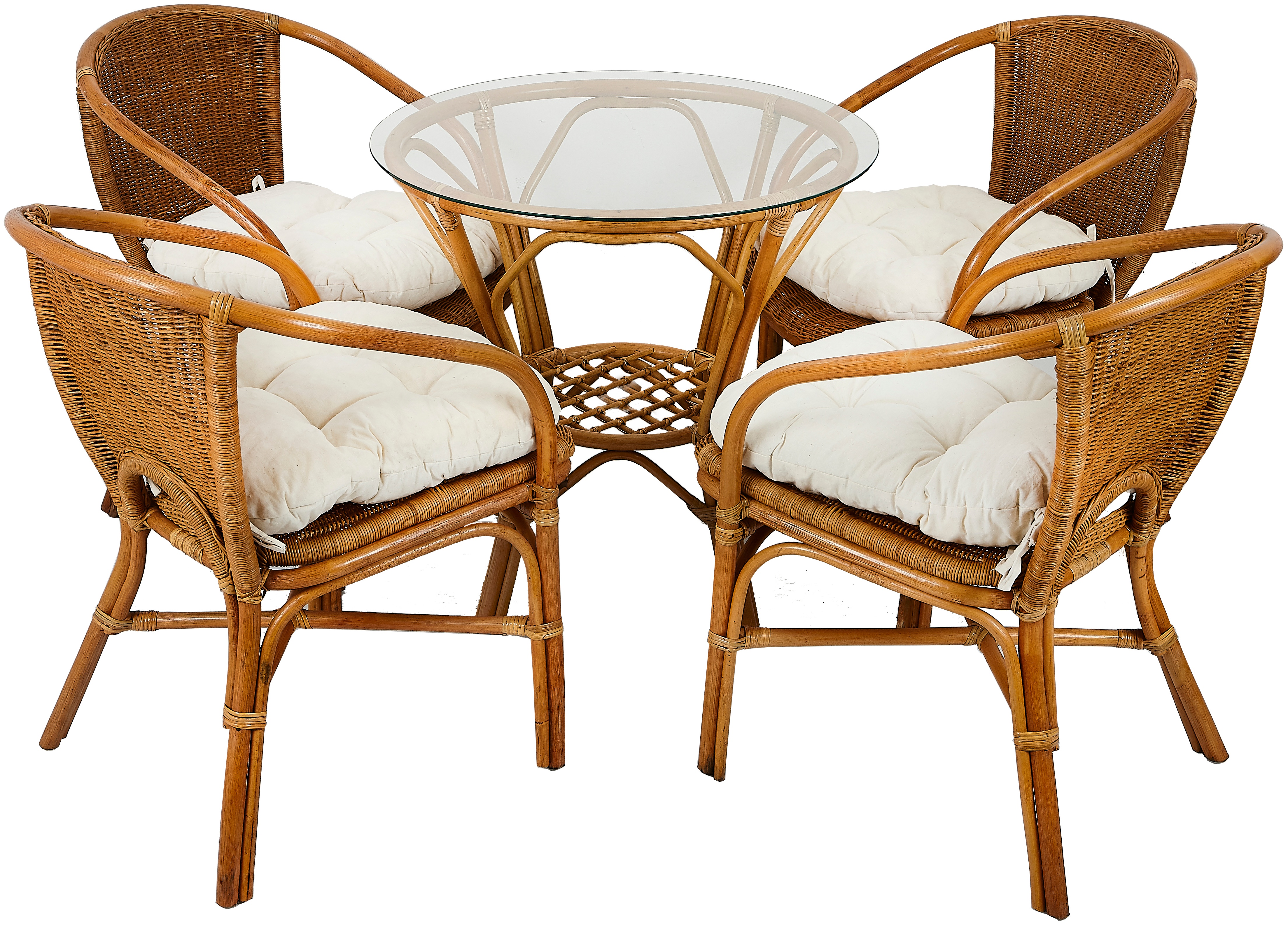 Kolekce obsahuje 4 ratanová křesla a ratanový stolek se skleněnou deskou. Stolek má ve spodní části plochu na ukládání drobných věcí.