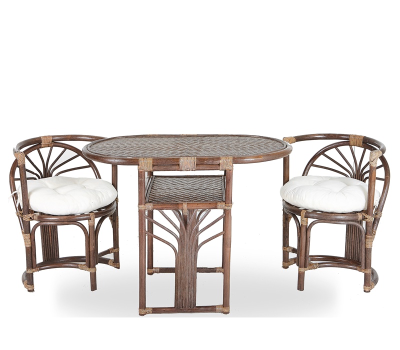 Kolekce obsahuje 2 ratanová křesla a ratanový stolek se skleněnou deskou.