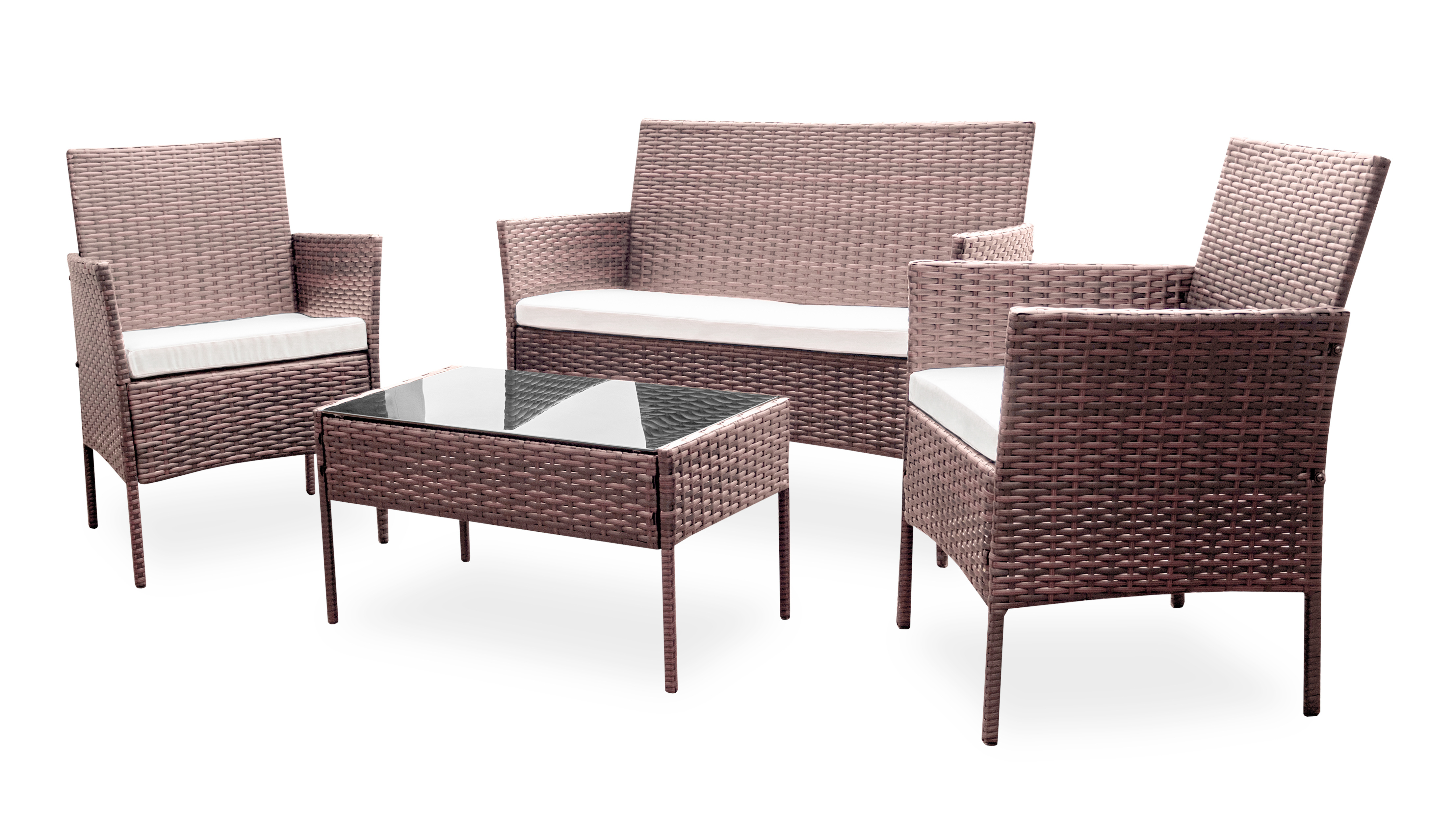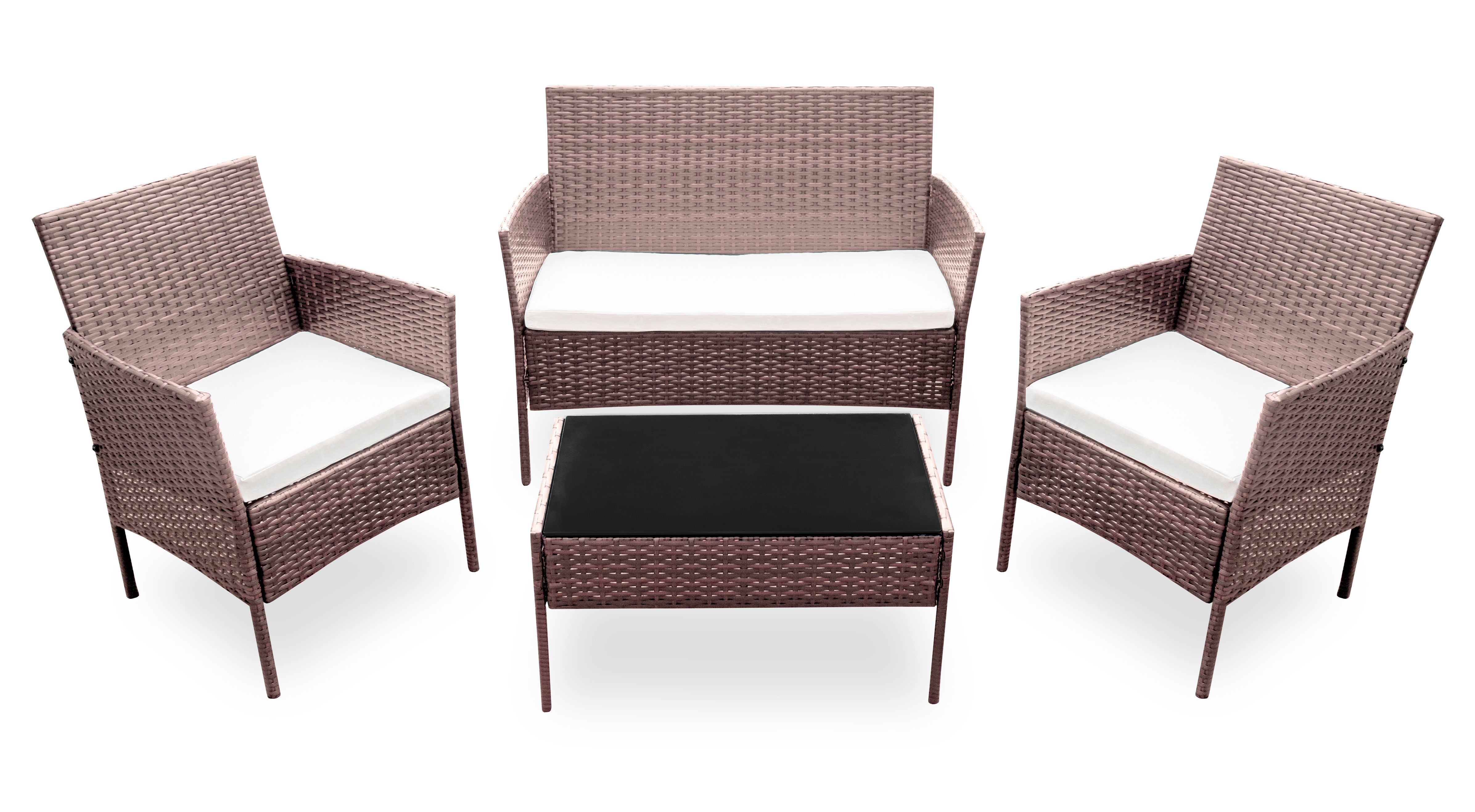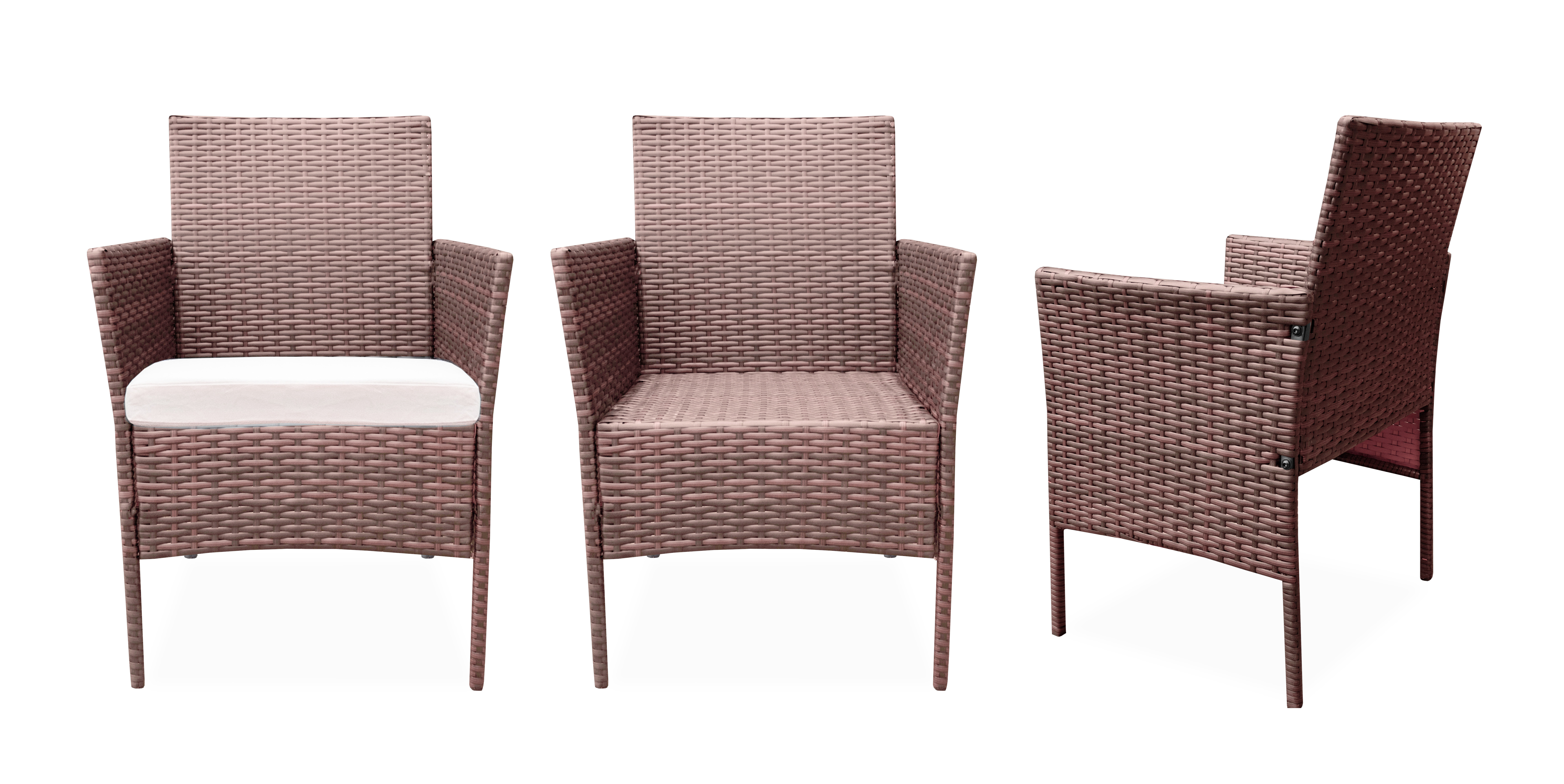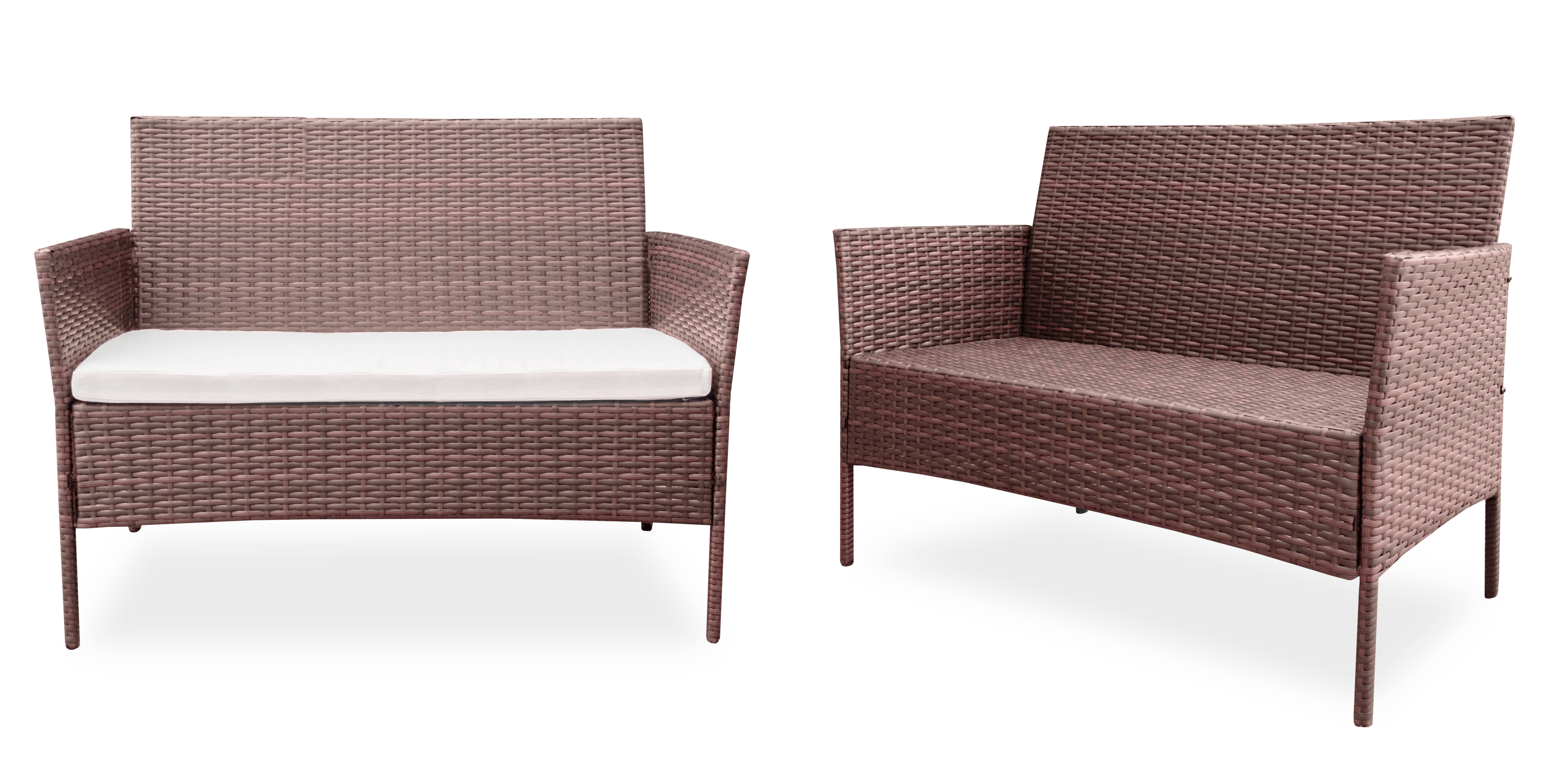 Stabilní kovová konstrukce s opletem z kvalitního umělého ratanu v hnědé barvě. Pohodlné odnímatelné polštářky o tloušťce 5 cm poskytují potřebný komfort během sezení.