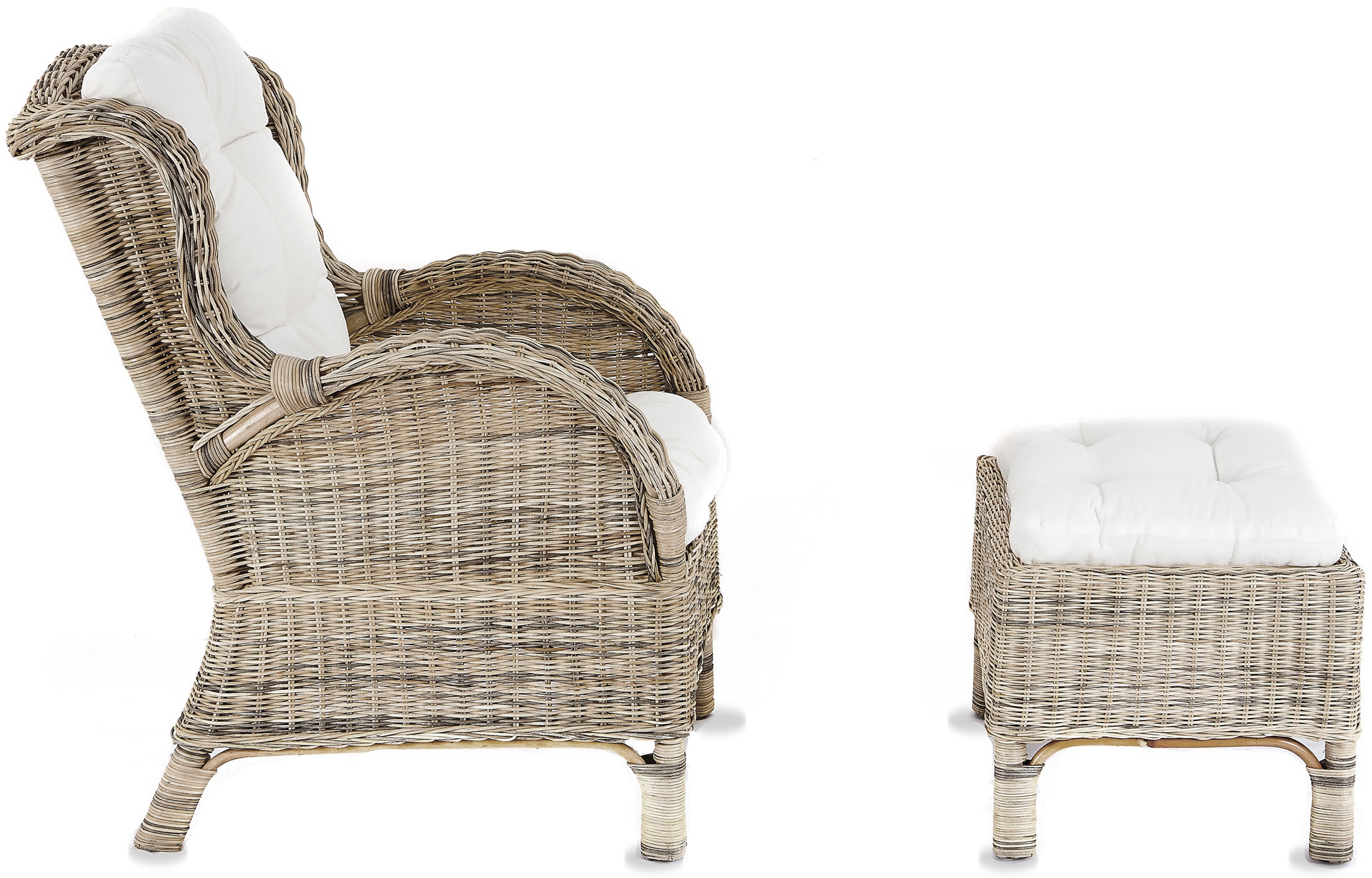 Kolekce obsahuje ratanové křeslo a ratanový taburet.