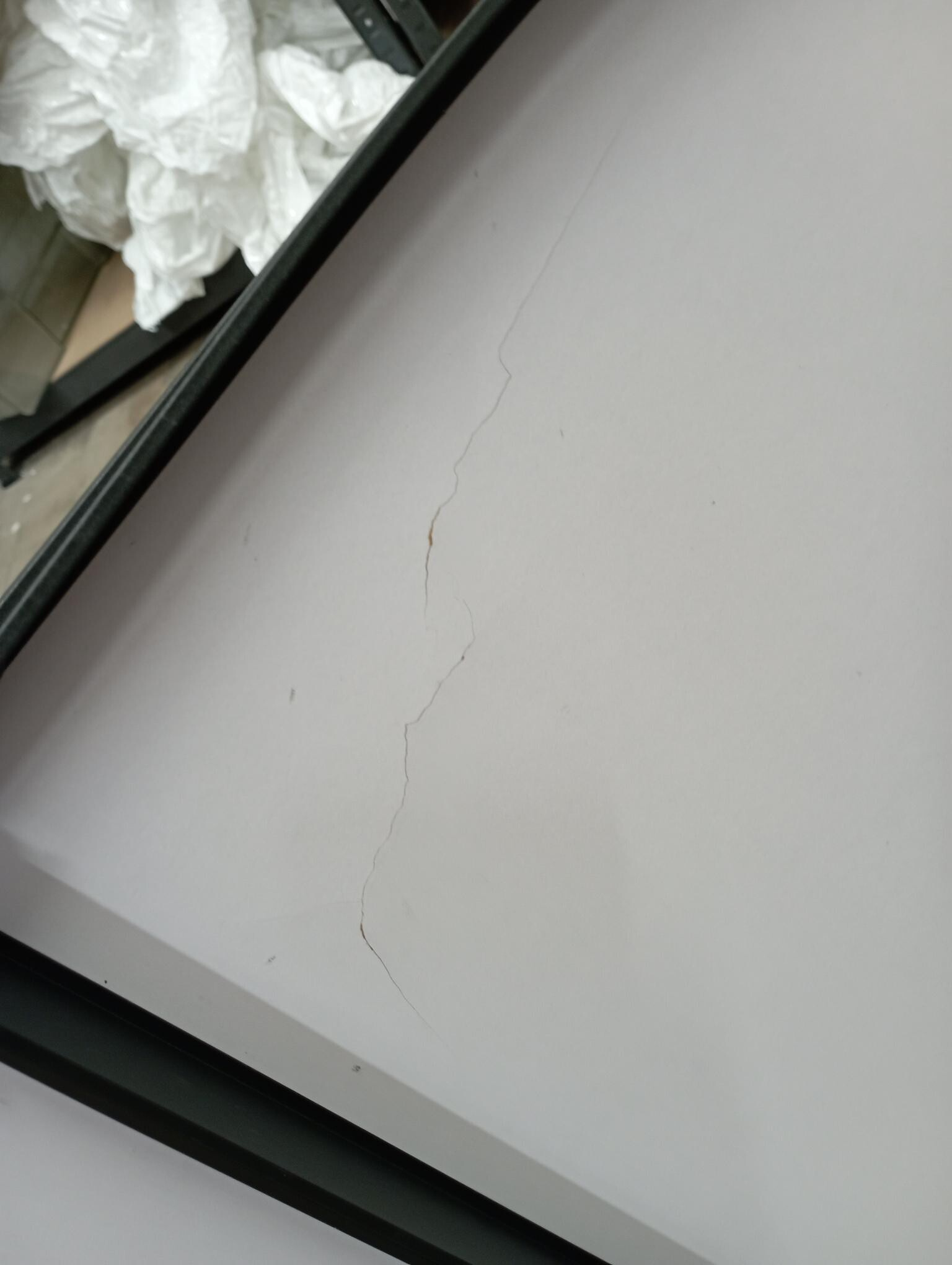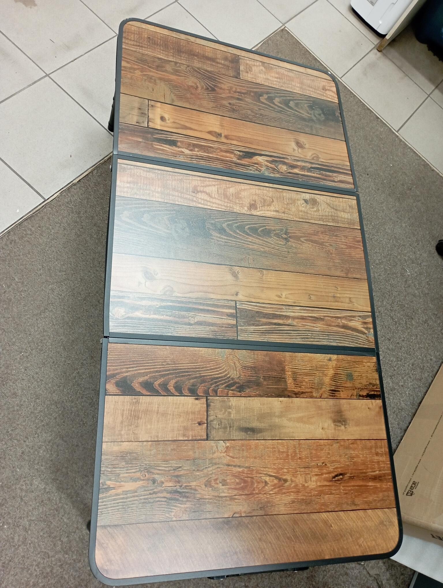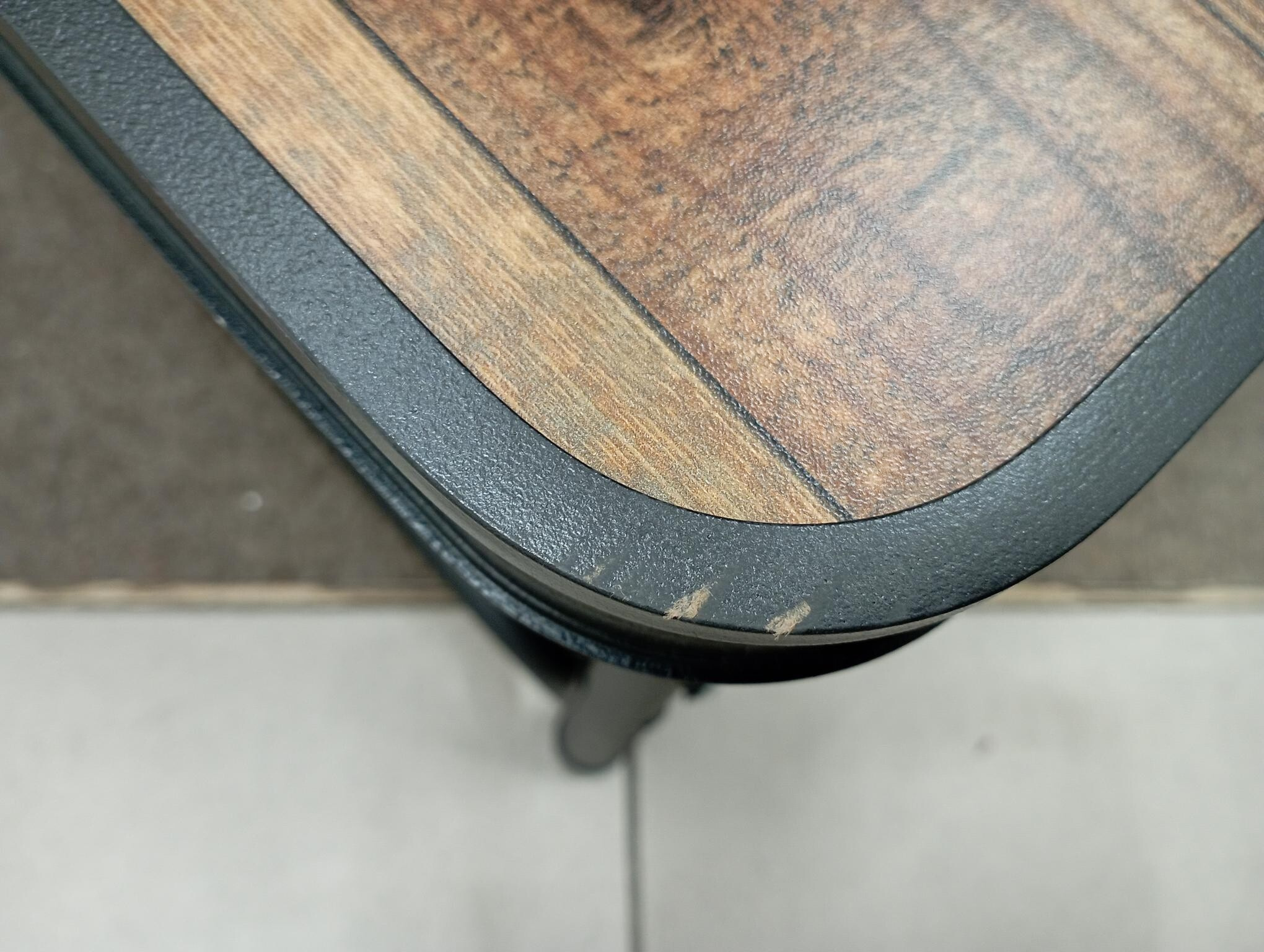 Tento kus je mírně poškrábaný, na spodní vrstvě plochy je prasklina, která však nemá vliv na užívání. Při složení je stůl mírně křivý – viz fotografie.