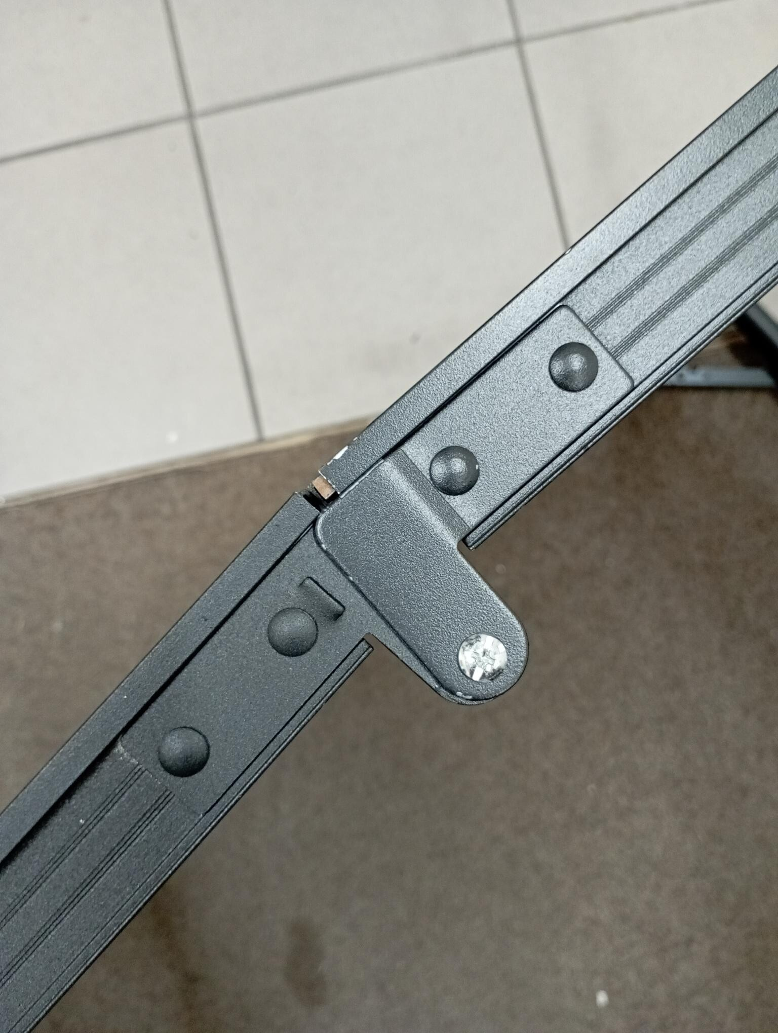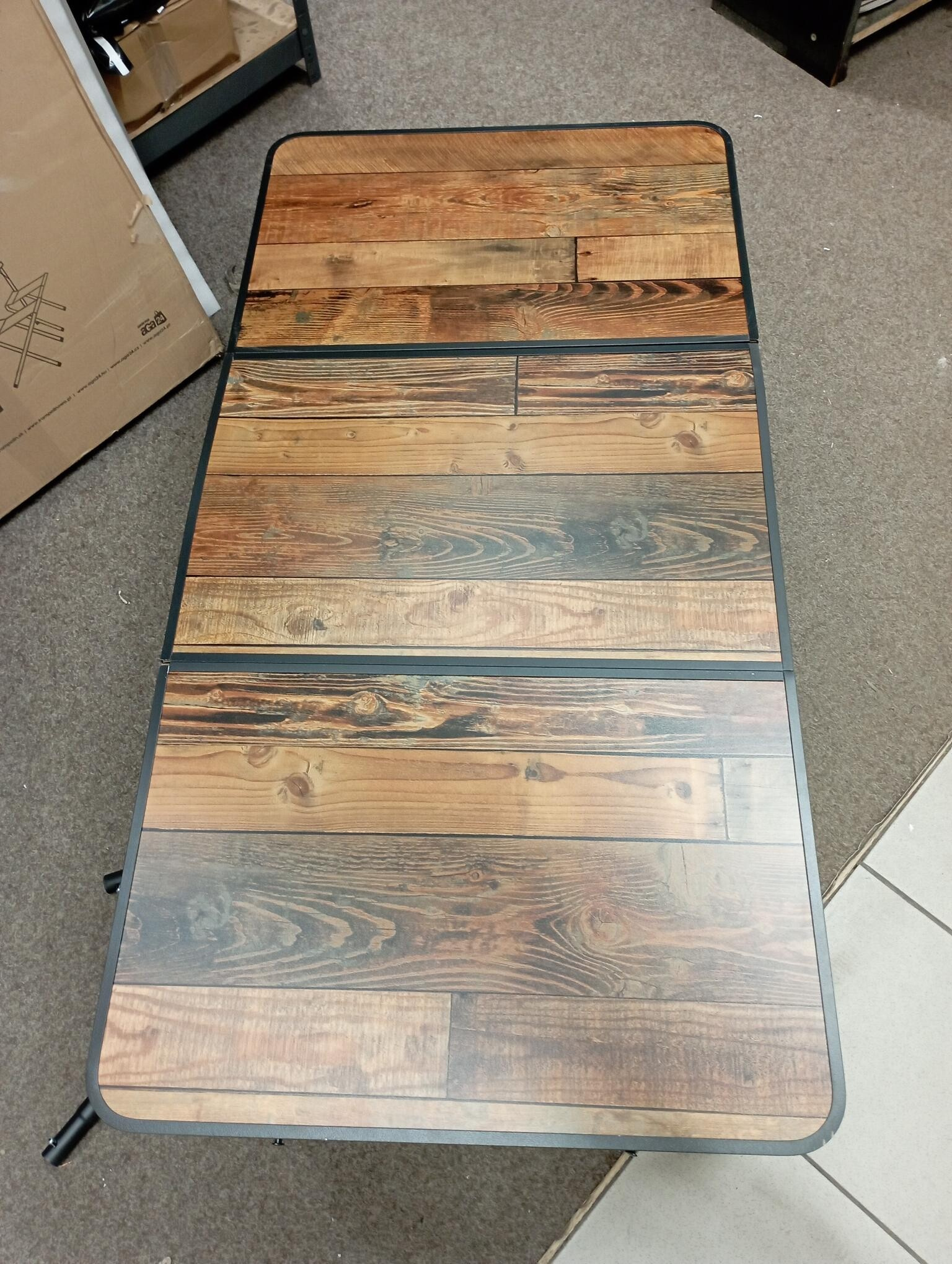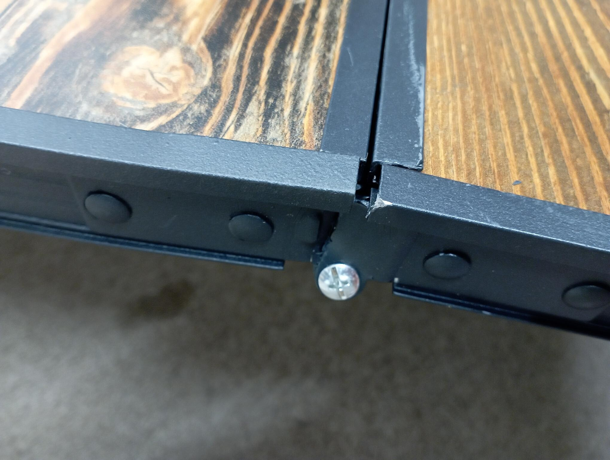 Tento kus je mírně poškrábaný, na spodní vrstvě plochy je prasklina, která však nemá vliv na užívání. Při složení je stůl mírně křivý – viz fotografie.