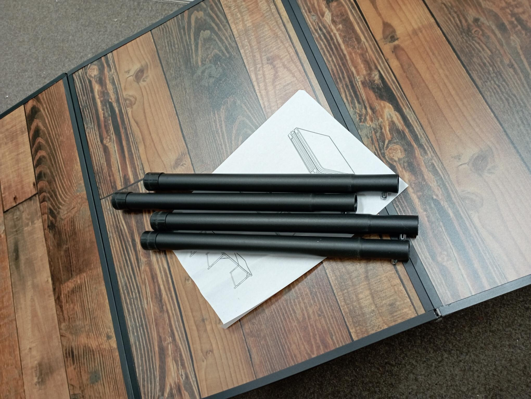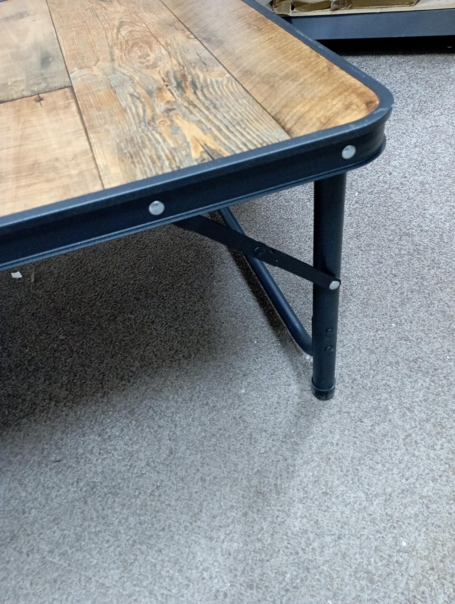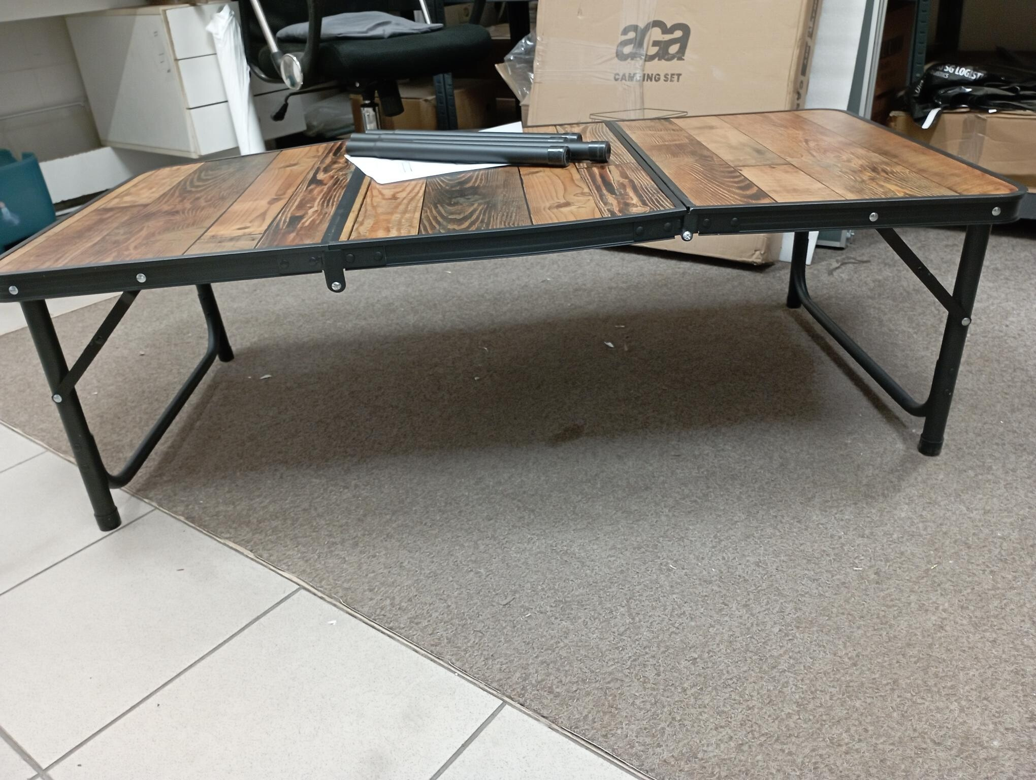 - Ve sbaleném stavu je stůl snadno přenosný v podobě ploché desky s uchem