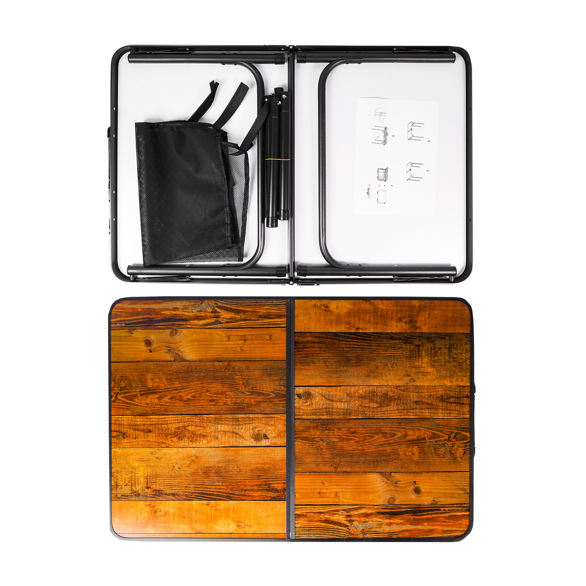 Kempingový stolek se dá složit do podoby malého kufříku. Součástí je i ucho, za které se dá složený stolek snadno přenášet.