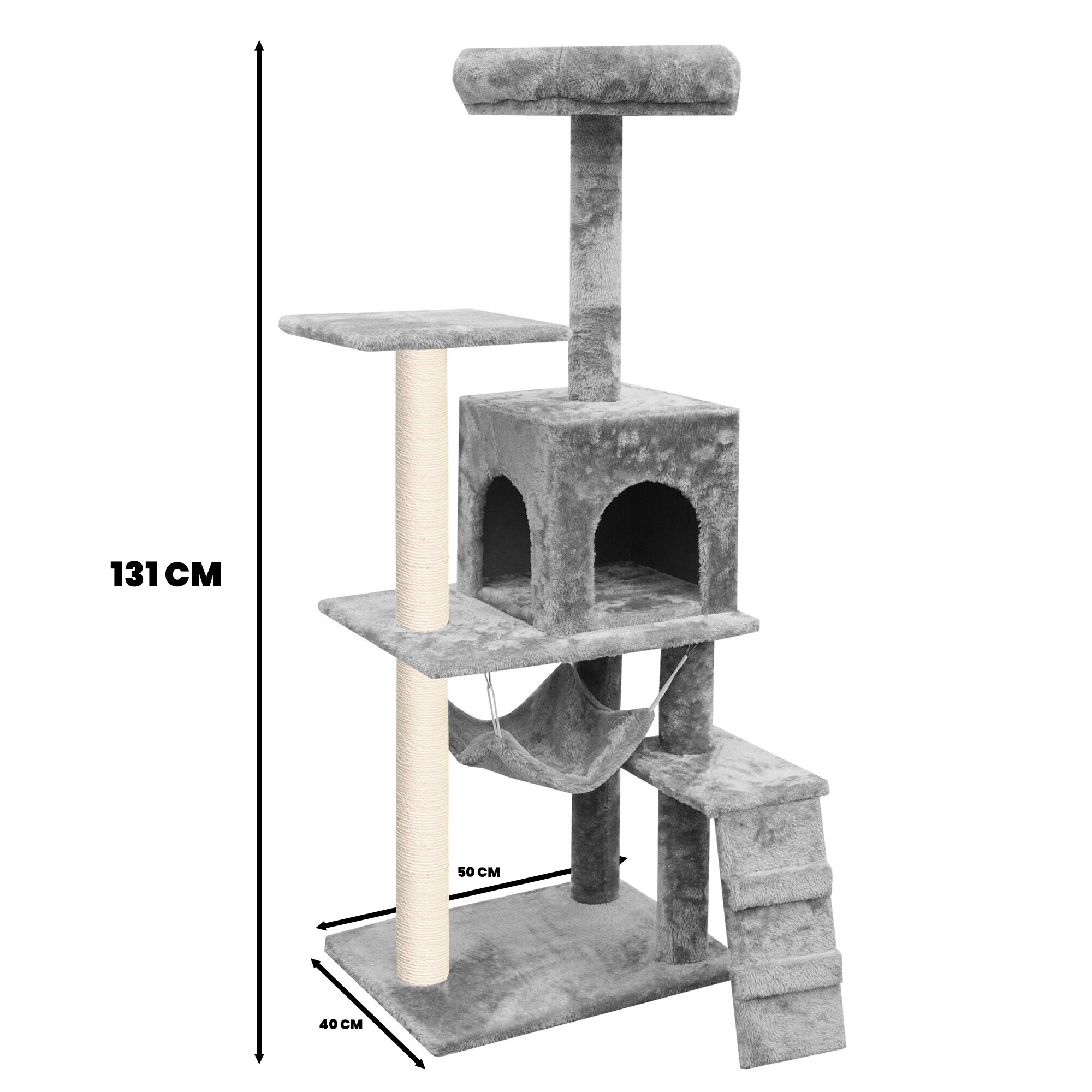 • Škrabadlo obsahuje: 1 domečky pro možnost úkrytu, 3 odpočívadla a sloupky potažené sisalem