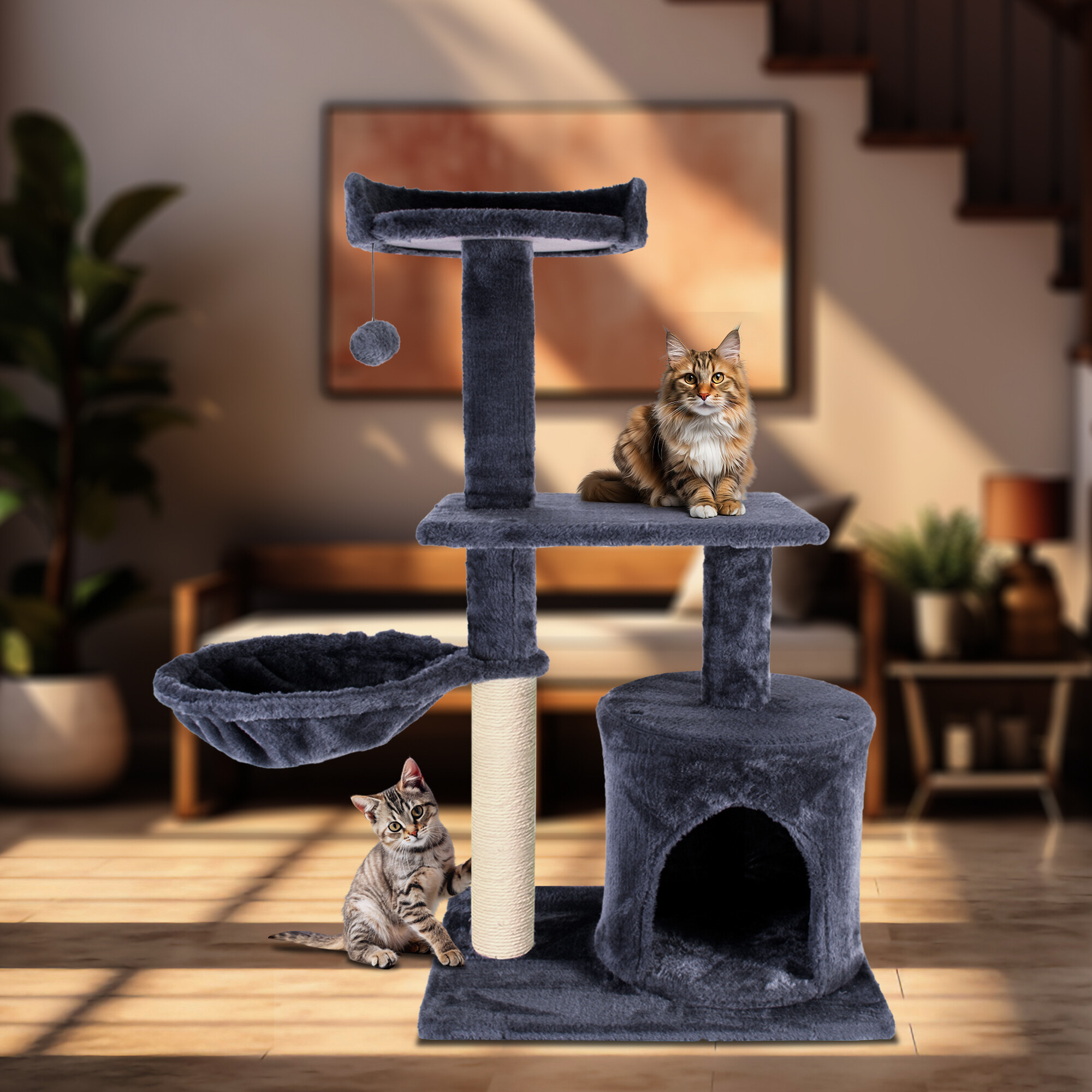 Škrabací strom omotaný kvalitním a silným sisalem jí kdykoliv poslouží k nabroušení drápků, aniž byste riskovali, že to udělá přesně tam, kde nechcete. Současně to bude díky hebkému plyši její oblíbené místo k odpočinku a hře.