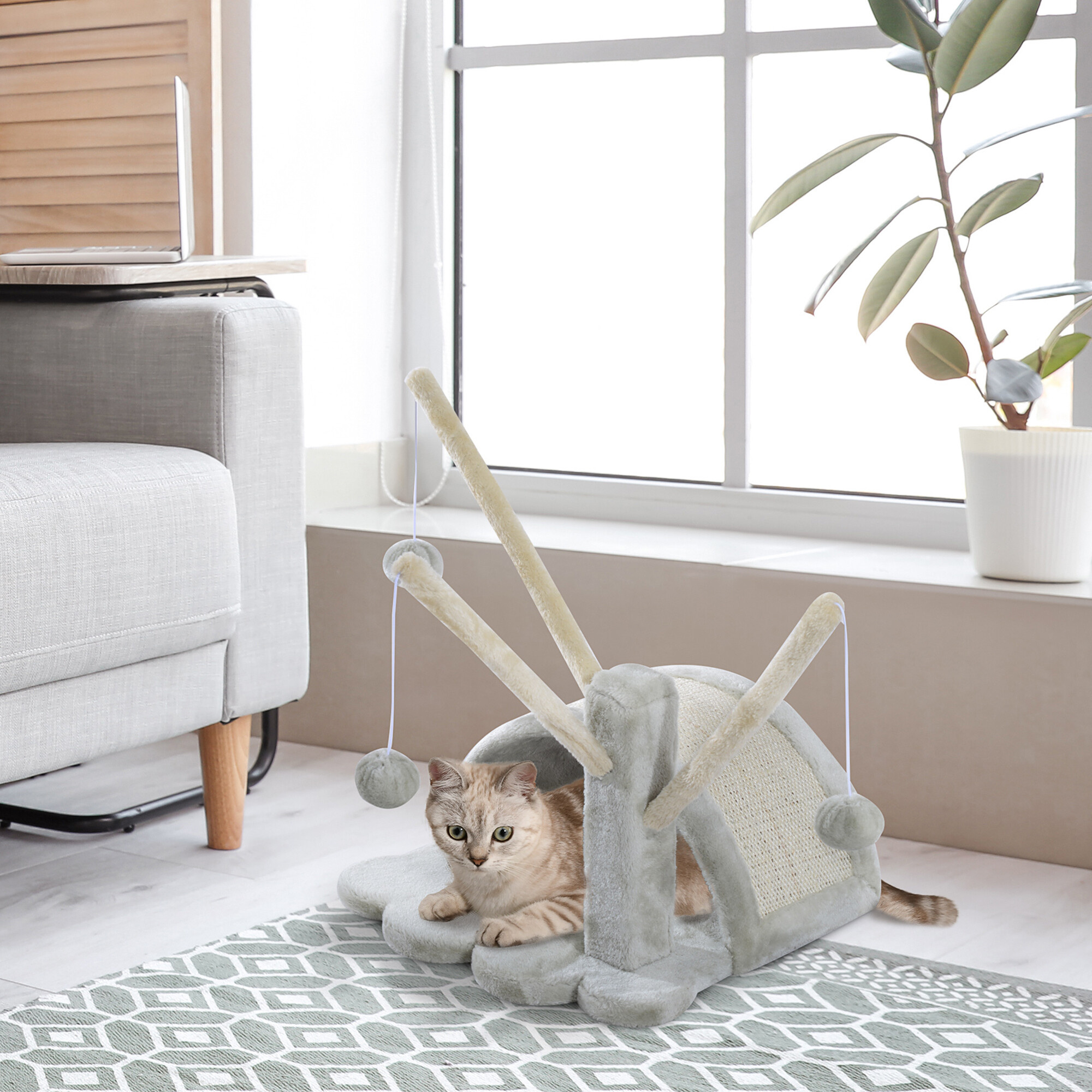 Škrabací most omotaný kvalitním a silným sisalem jí kdykoliv poslouží k nabroušení drápků, aniž byste riskovali, že to udělá přesně tam, kde nechcete. Současně to bude díky hebkému plyši její oblíbené místo k odpočinku a hře.