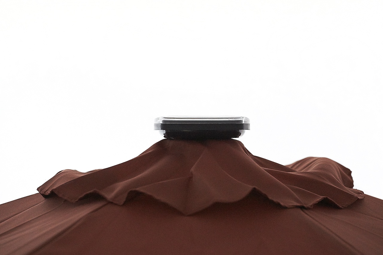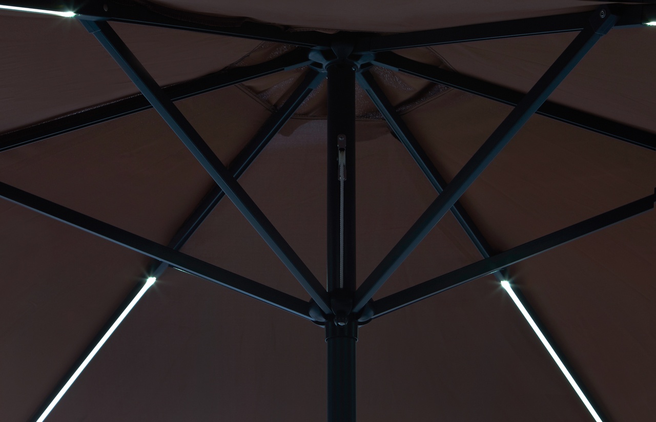 Obsahuje LED pásky, které jsou napájeny ze solárního panelu umístěného na deštníku.