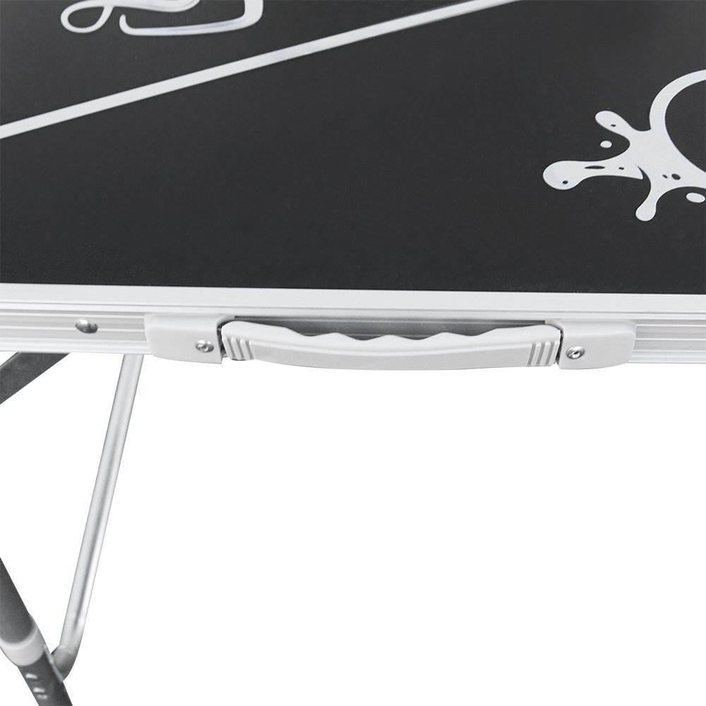 - Ve sbaleném stavu je stůl snadno transportovatelný v podobě ploché desky s uchem