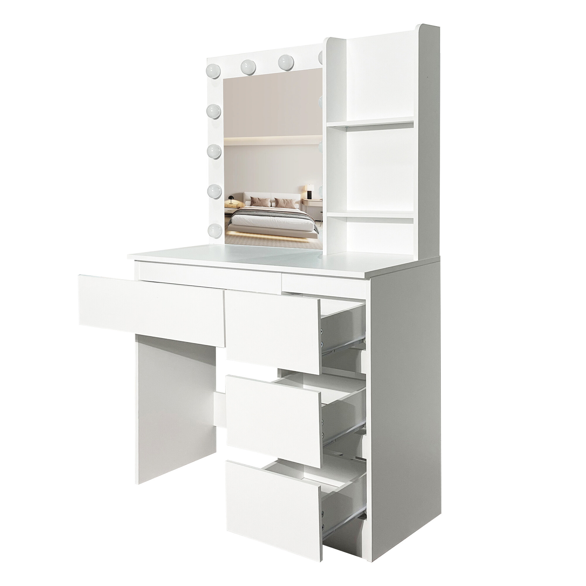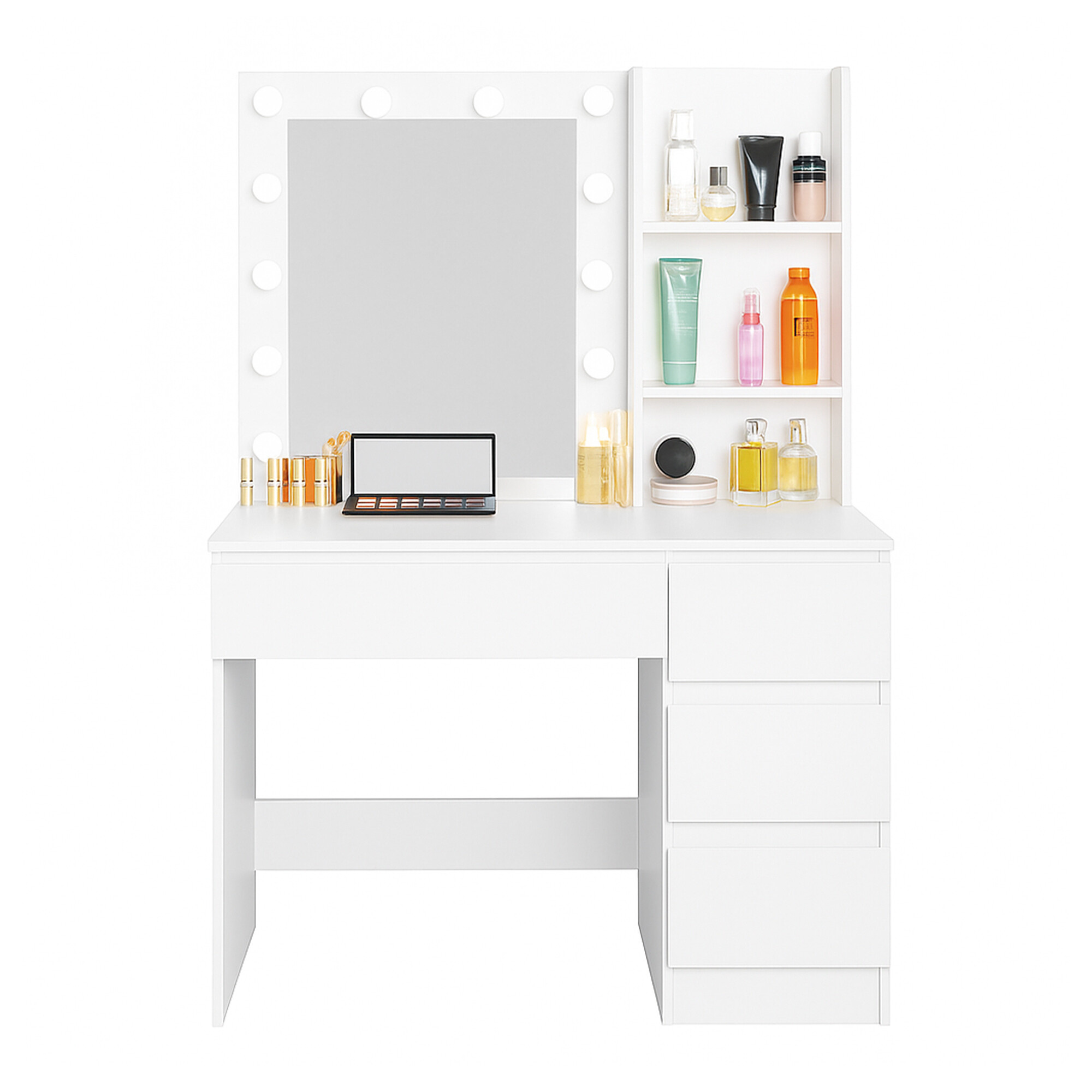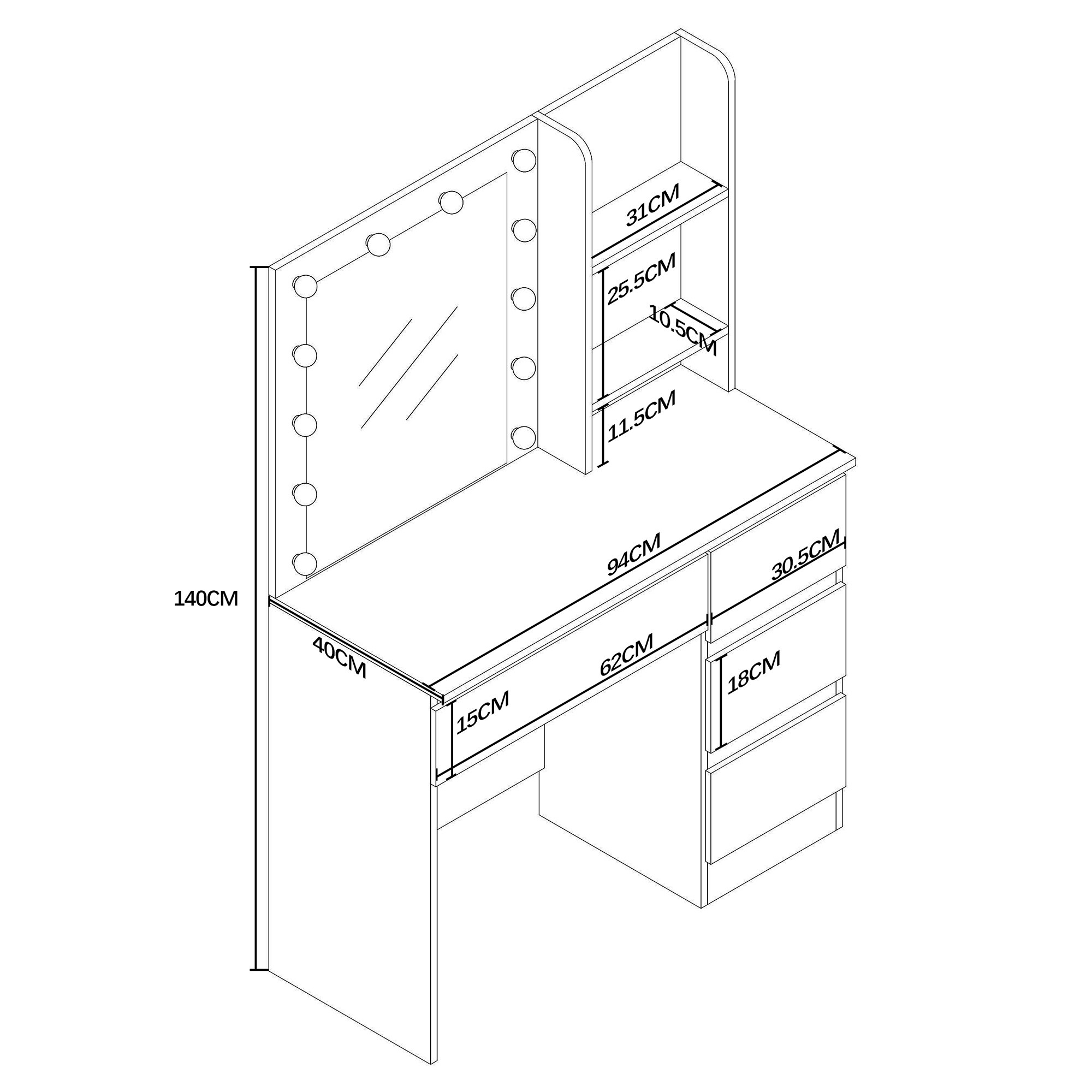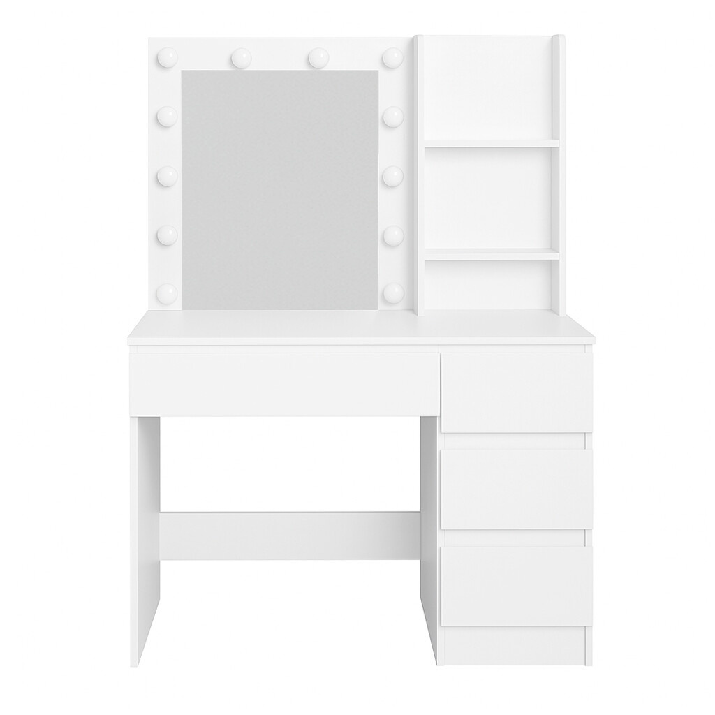 Stolek je vybaven prostornou pracovní deskou, na kterou se pohodlně vejde kosmetika i doplňky. Čtyři praktické zásuvky umožňují přehledné uložení make-upu, šperků a dalších potřeb, zatímco dvě otevřené poličky po stranách zrcadla poskytují prostor pro dekorace nebo často používané produkty.