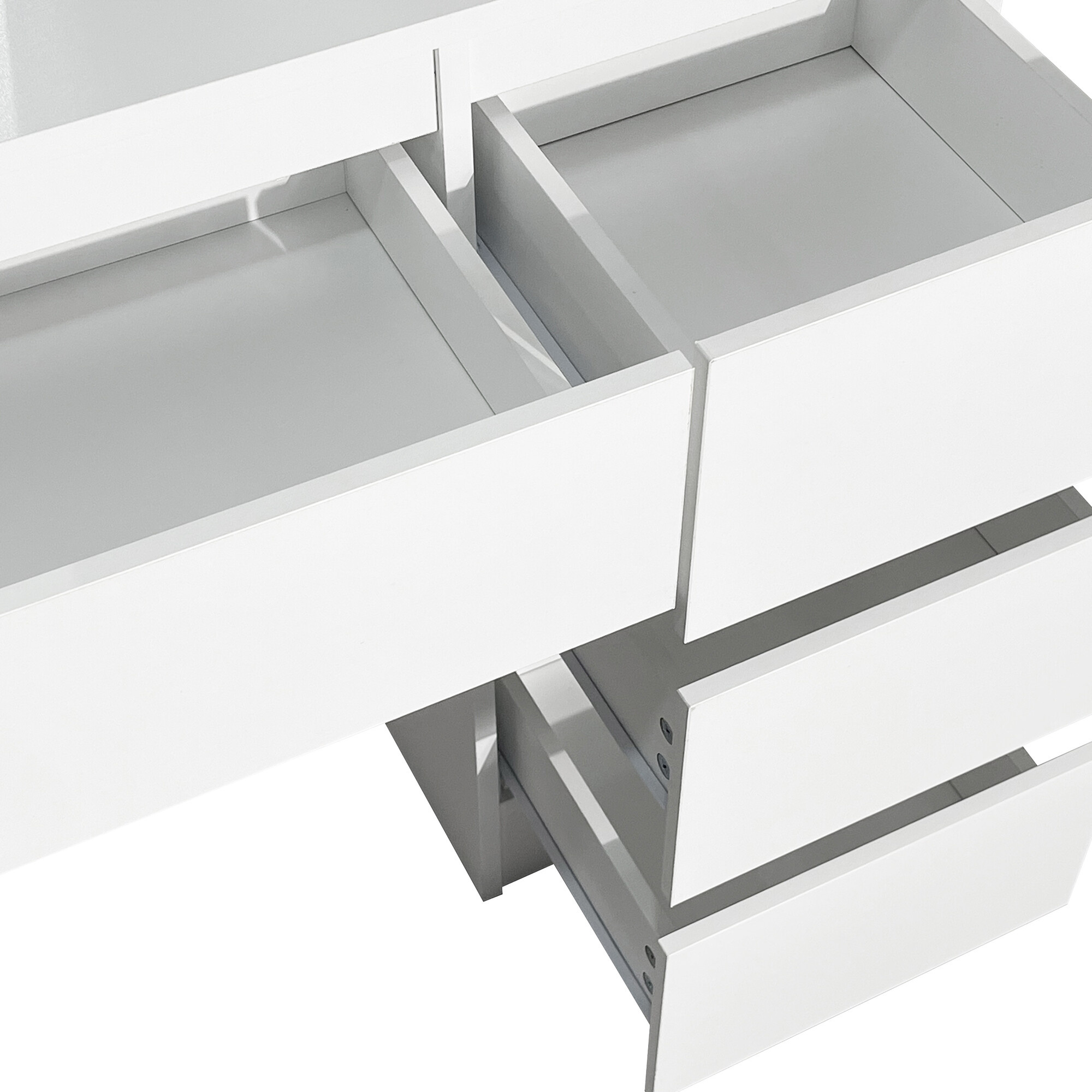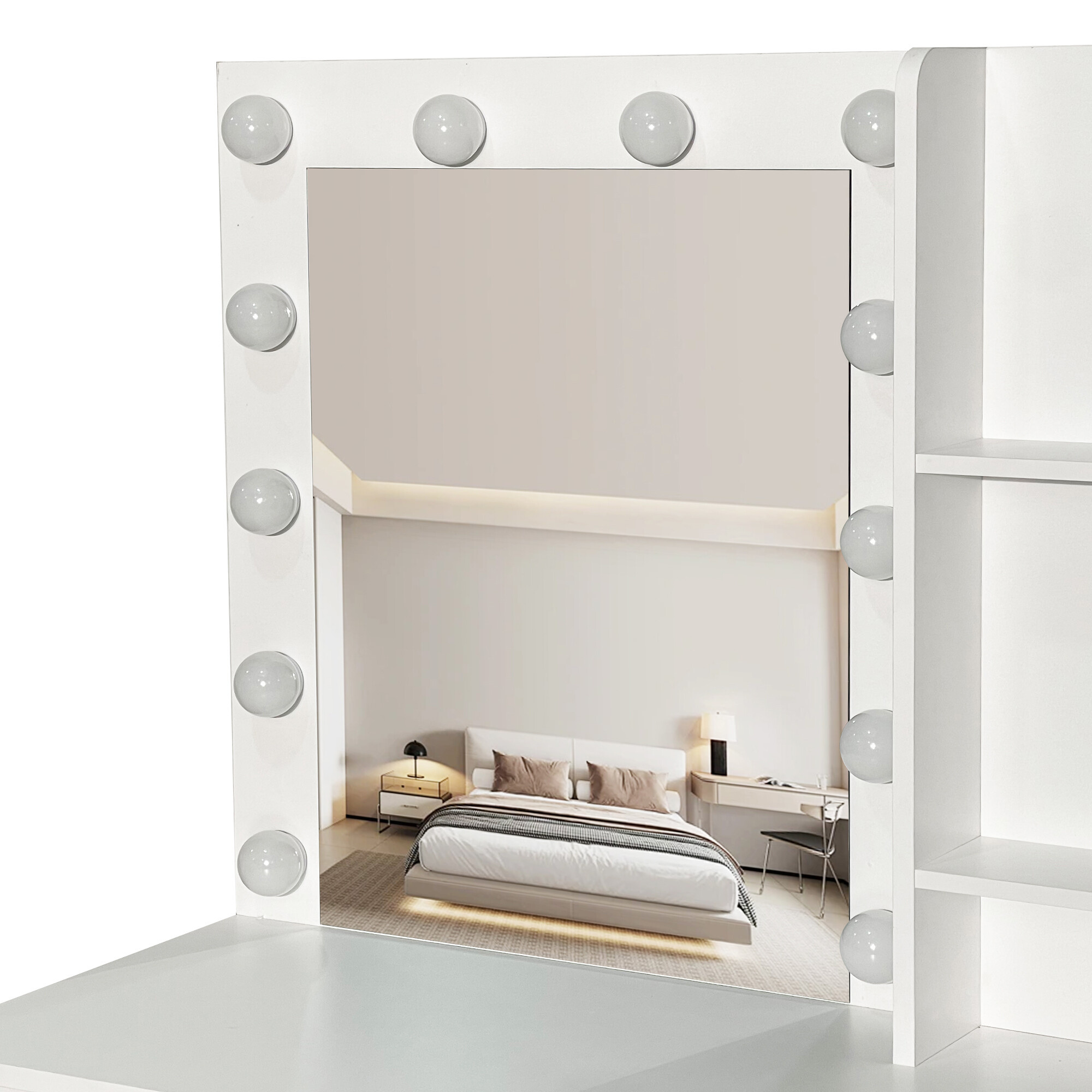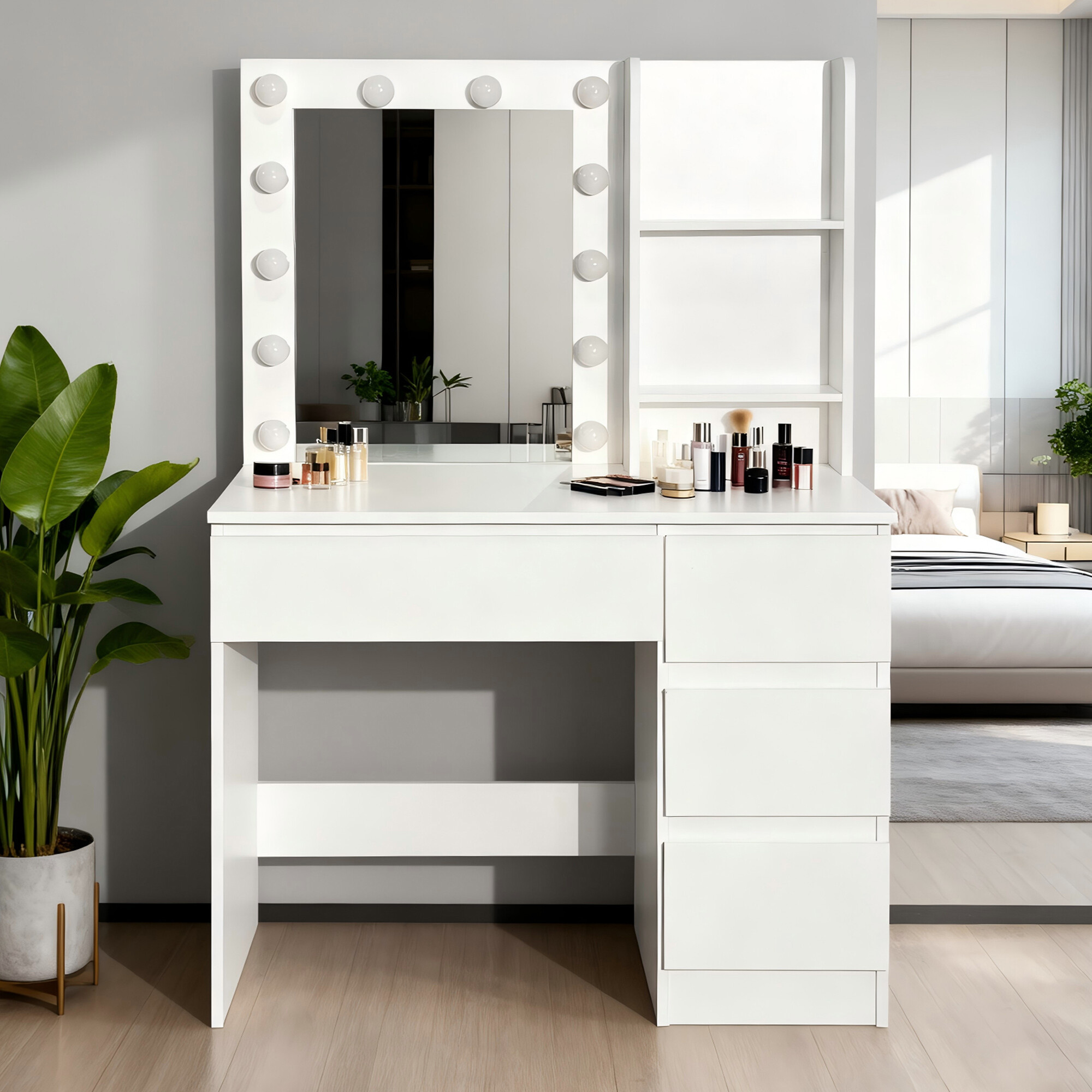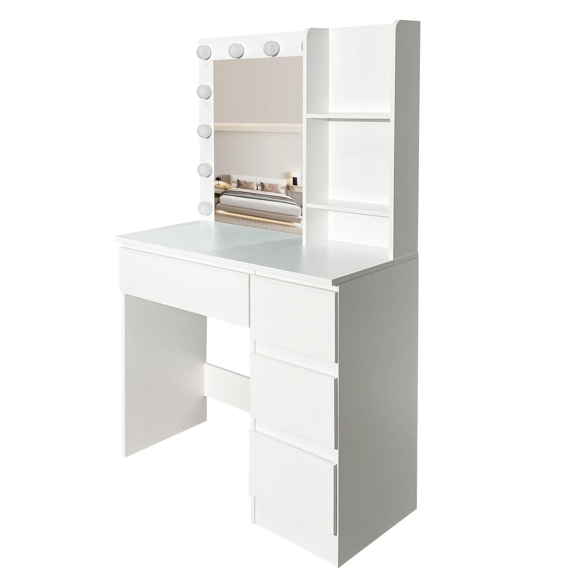 Stolek je vybaven prostornou pracovní deskou, na kterou se pohodlně vejde kosmetika i doplňky. Čtyři praktické zásuvky umožňují přehledné uložení make-upu, šperků a dalších potřeb, zatímco dvě otevřené poličky po stranách zrcadla poskytují prostor pro dekorace nebo často používané produkty.