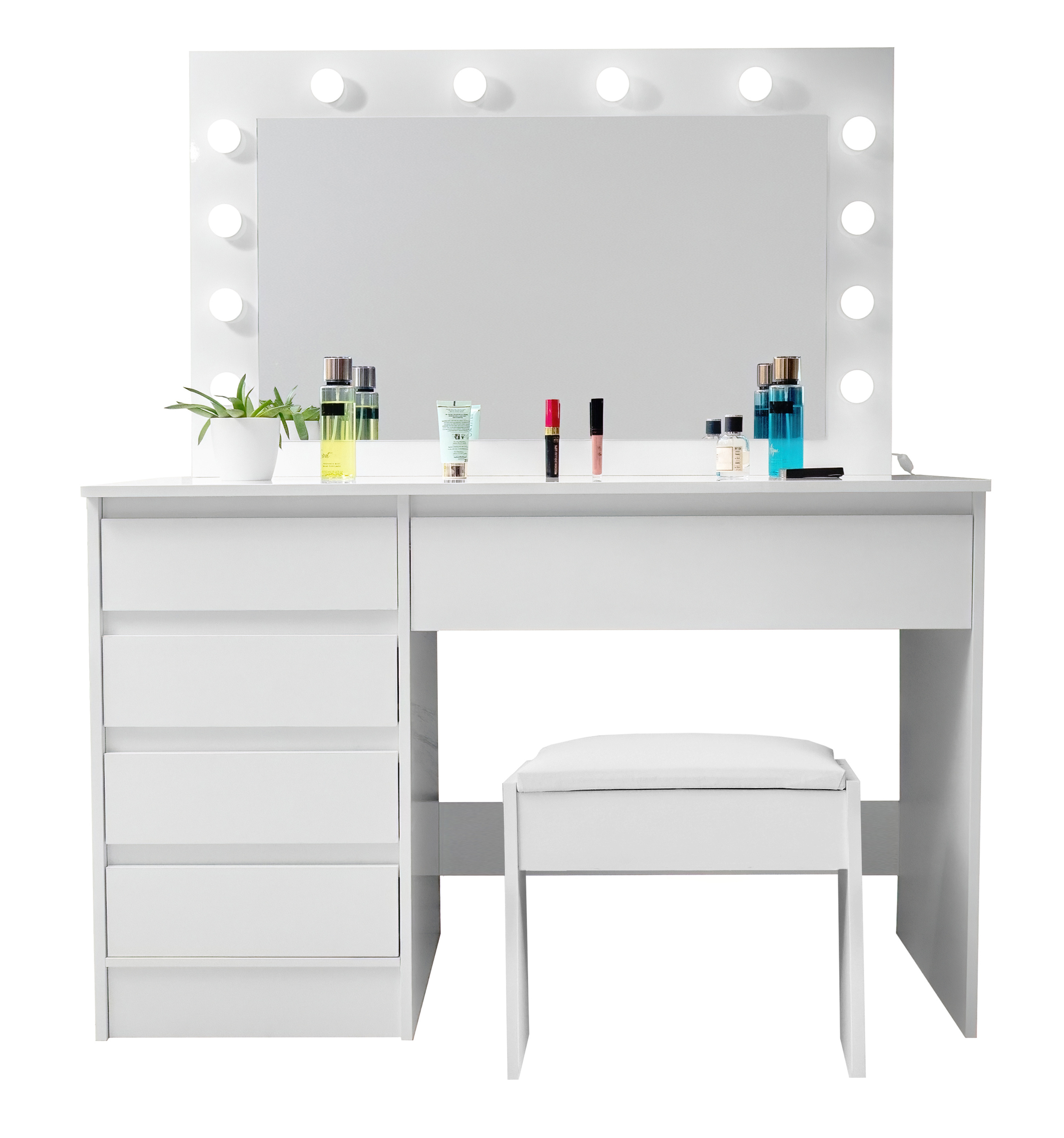 Na zrcadle je 12 LED žárovek, pohodlně se tedy nalíčíte i při špatném přirozeném světle. Taburet je vyrobený z vysoce kvalitní měkké a pěny, na které je možné sedět celé hodiny.