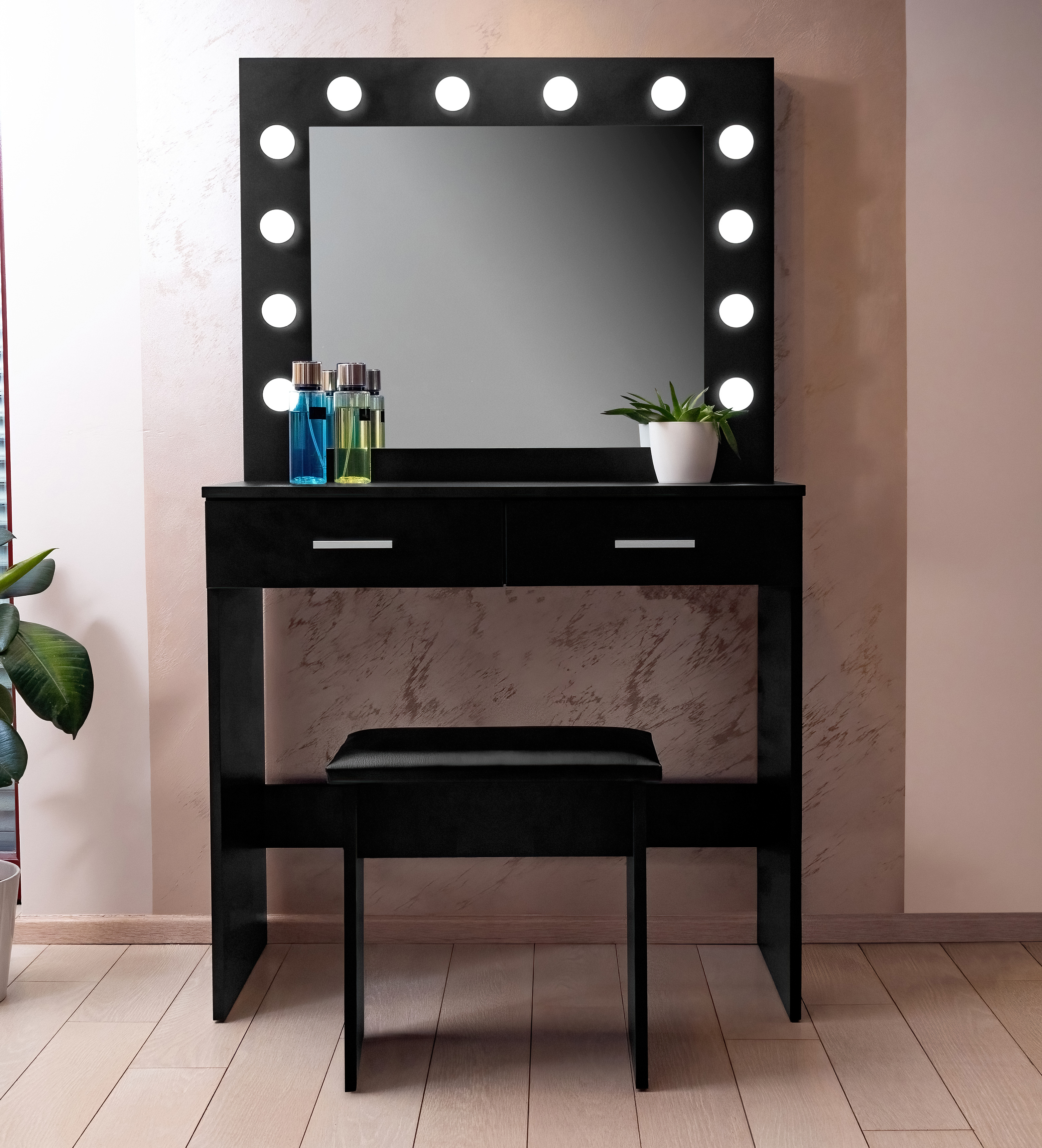 Na zrcadle je 12 LED žárovek, pohodlně se tedy nalíčíte i při špatném přirozeném světle. Taburet je vyrobený z vysoce kvalitní měkké a pěny, na které je možné sedět celé hodiny.
