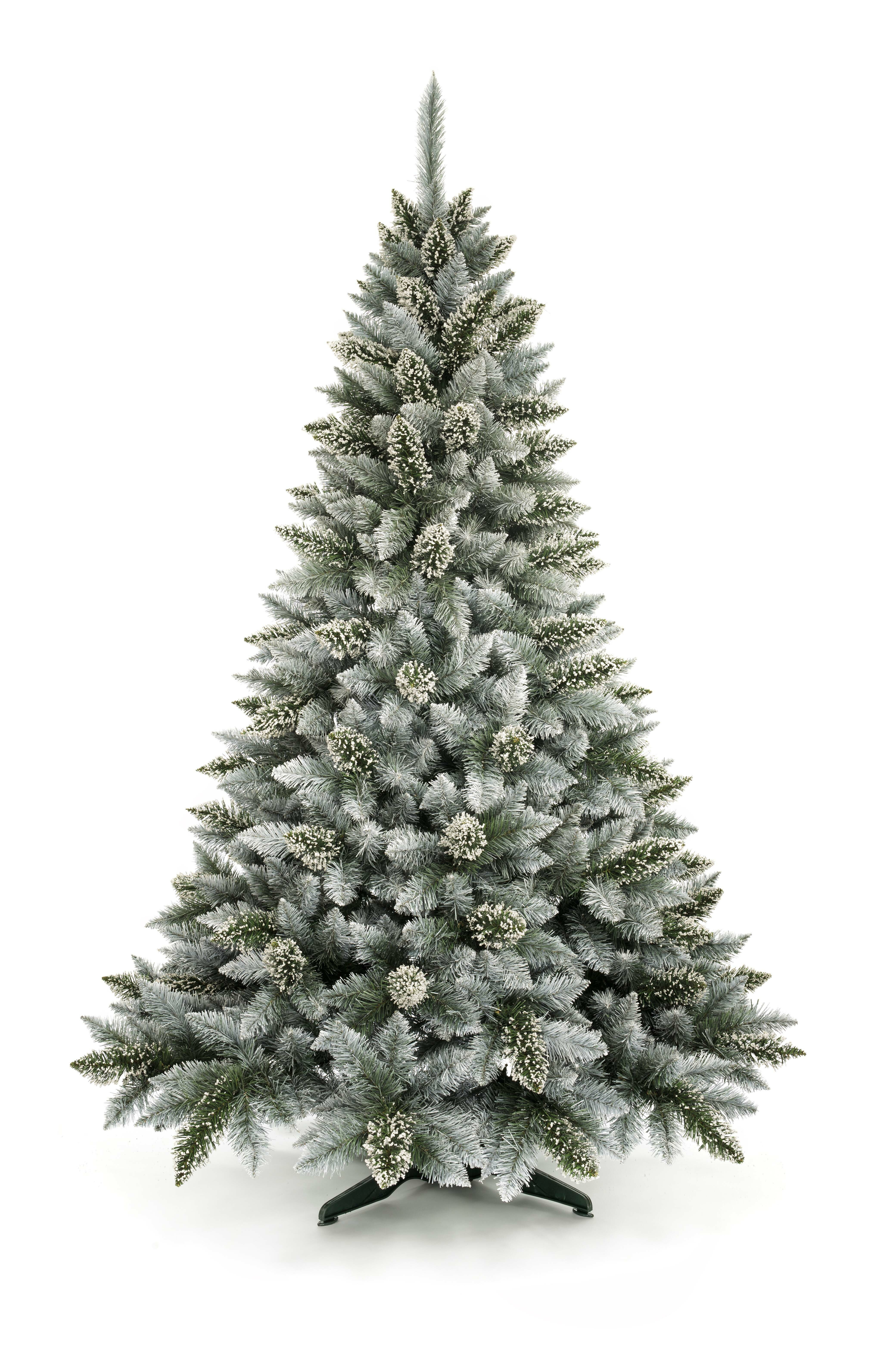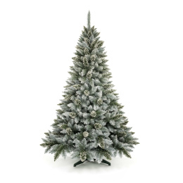 Luxusní umělý vánoční stromeček s celkovou výškou 150 cm v přírodním vzhledu zasněžené zelené husté borovice.