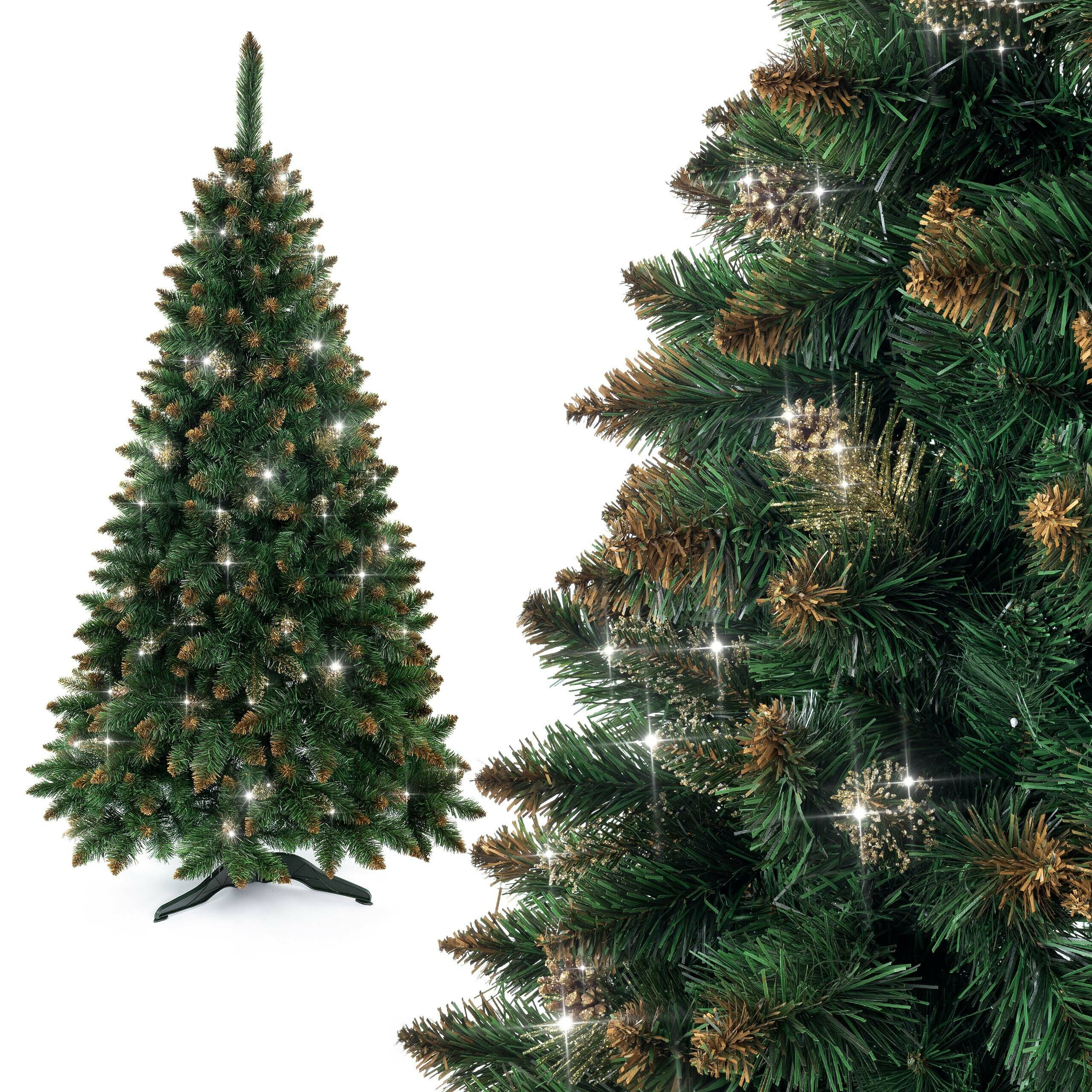 Luxusní umělý vánoční stromeček s celkovou výškou 150 cm v přírodním vzhledu krásné zelené husté borovice, která je ozdobena zlatými třpytkami.