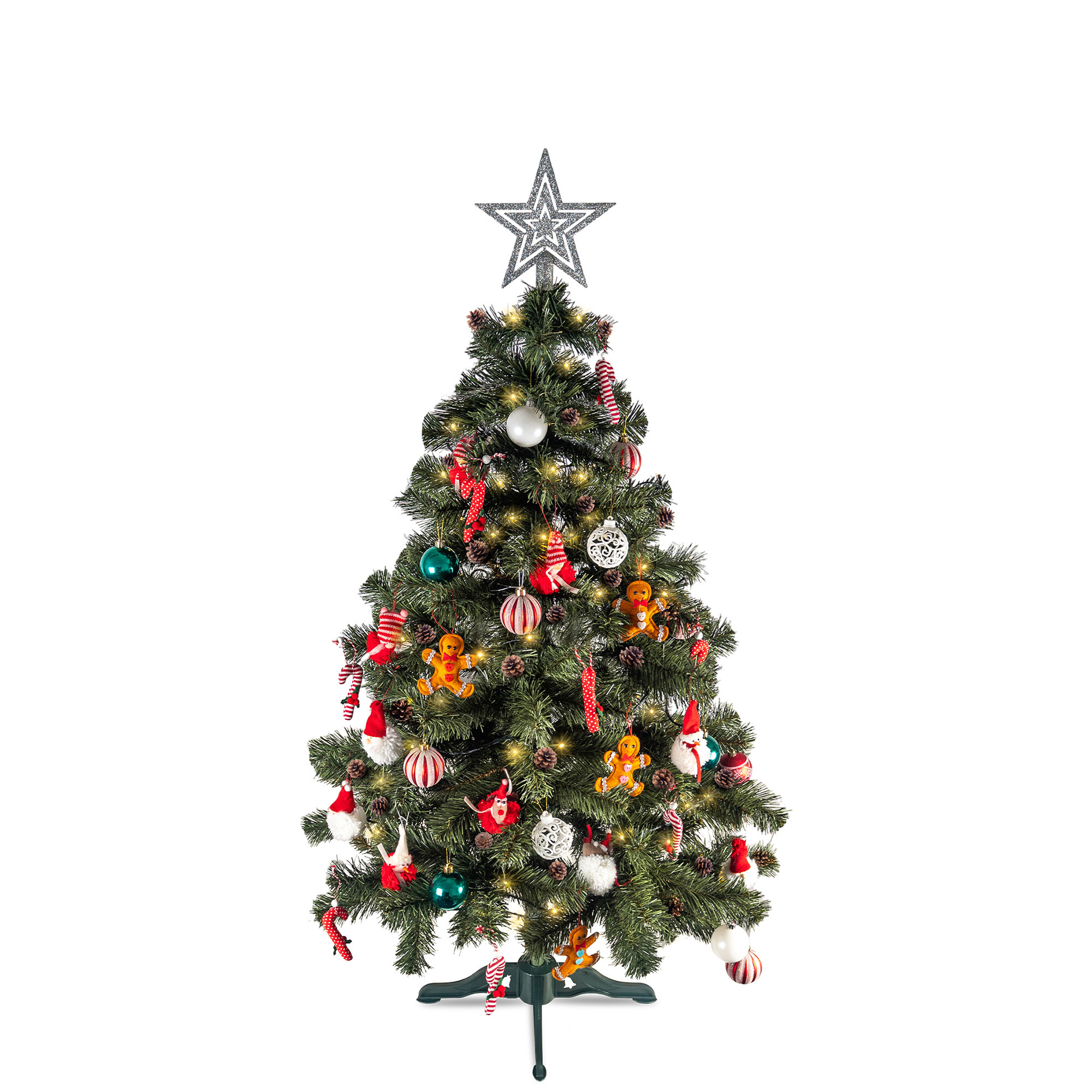 Součástí balení vánočního stromečku jsou šišky i čtyřramenný plastový stojan.