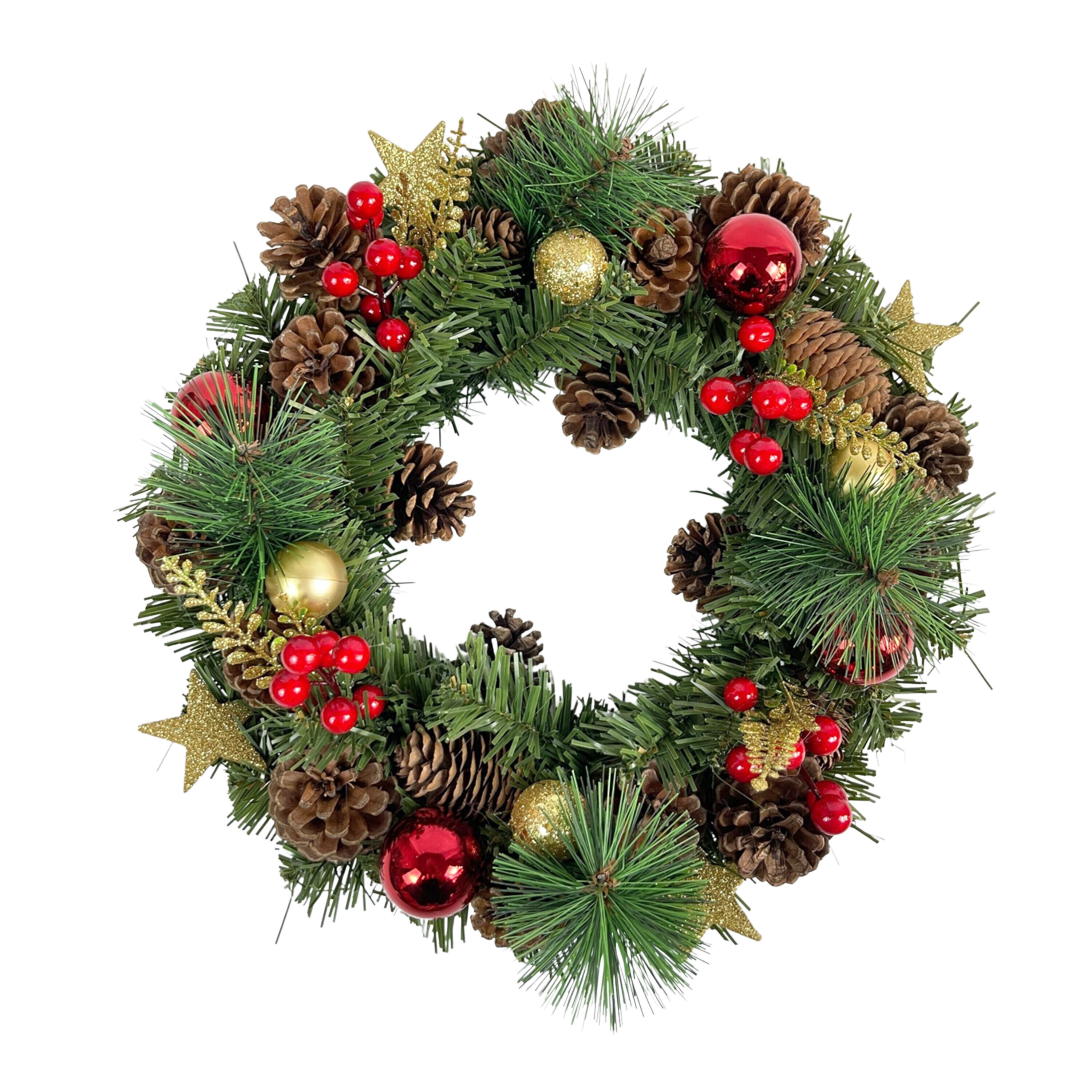Krásný vánoční věnec zdobený drobnými ozdobami je univerzální a stylovou ozdobou pro vánoční čas.