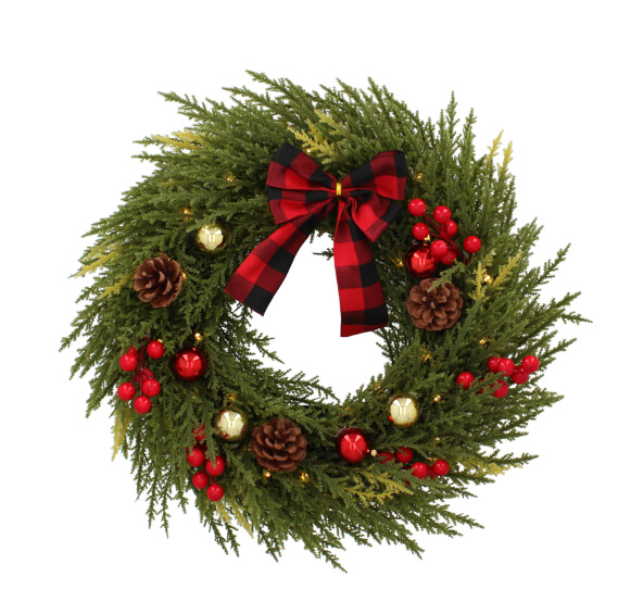 Krásný vánoční LED věnec zdobený drobnými ozdobami je univerzální a stylovou ozdobou pro vánoční čas.