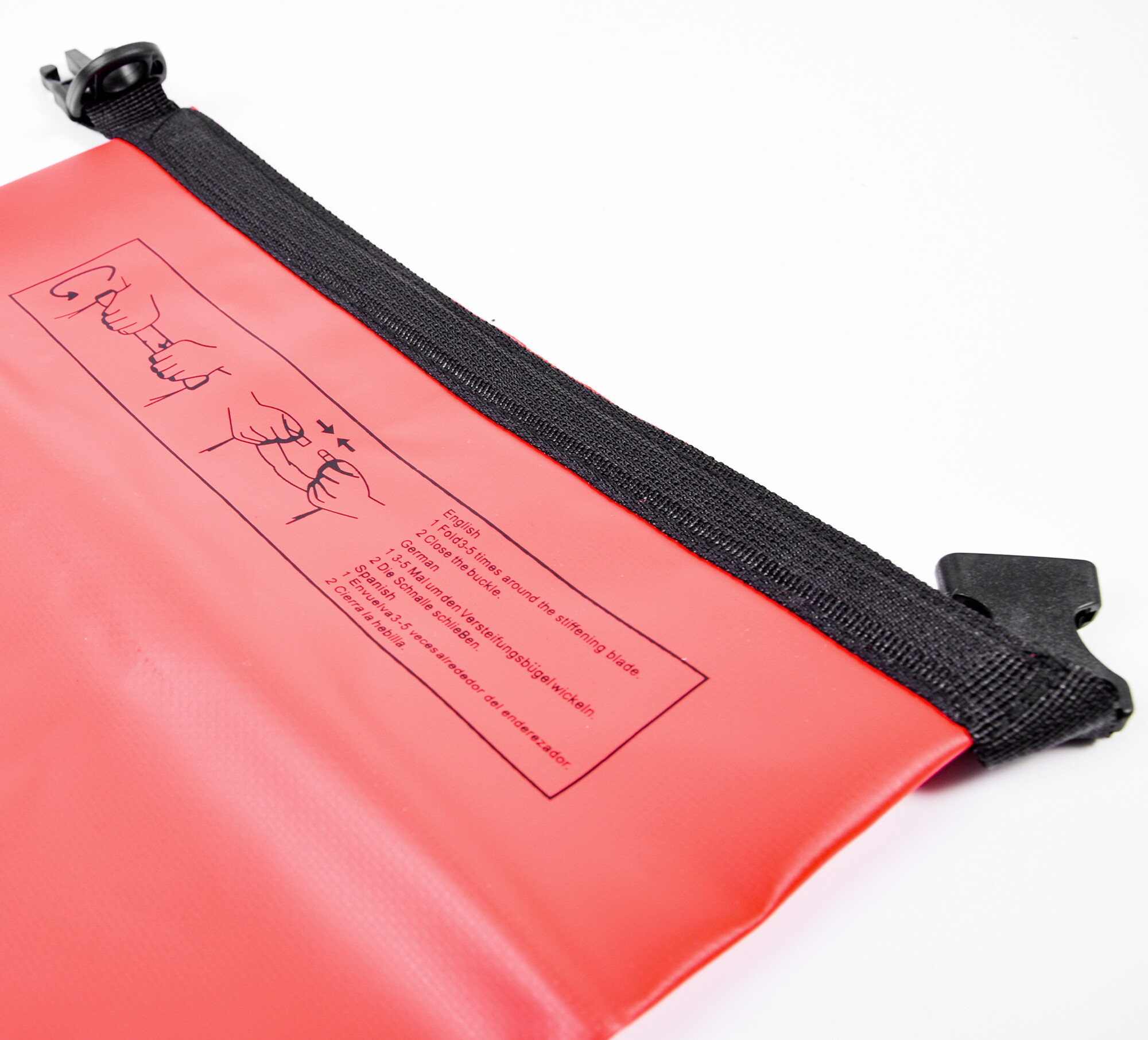 Naplňte vak věcmi tak, aby zůstala aspoň čtvrtina vaku prázdná. Vrchní část přeložte alespoň třikrát až pětkrát směrem dolů, potom oba konce spojte a zacvakněte přezku. Vaše věci tak budou perfektně chráněny proti vodě a vlhkosti, a to například i v případě převrácení lodi.