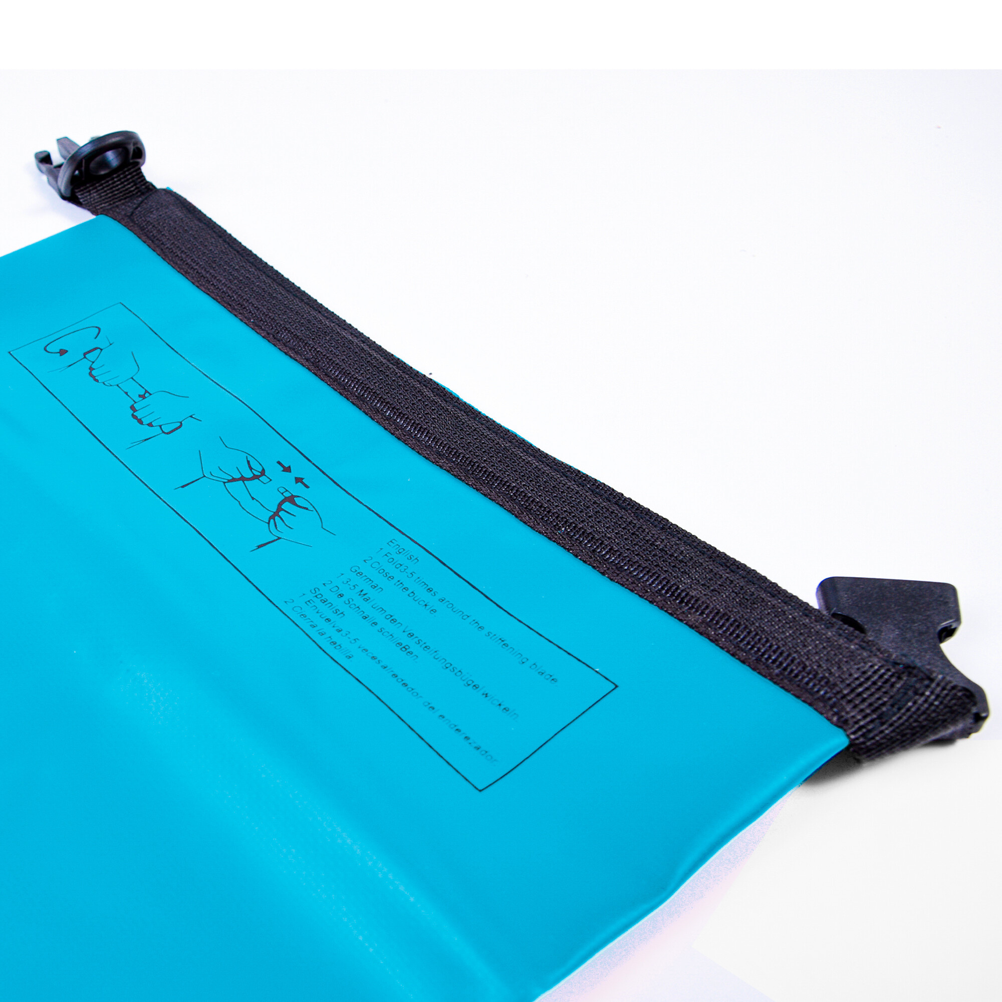 Naplňte vak věcmi tak, aby zůstala aspoň čtvrtina vaku prázdná. Vrchní část přeložte alespoň třikrát až pětkrát směrem dolů, potom oba konce spojte a zacvakněte přezku. Vaše věci tak budou perfektně chráněny proti vodě a vlhkosti, a to například i v případě převrácení lodi.