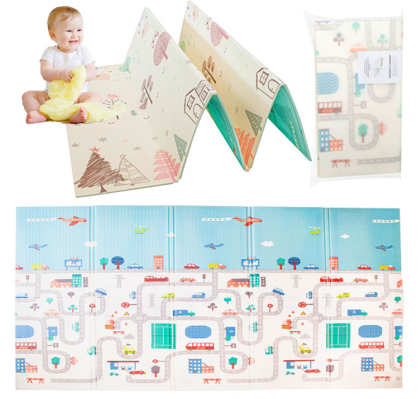 Velká oboustranná pěnová hrací podložka se vzorem ulic a lesa. Skvěle se hodí jako koberec do dětského pokoje. Podložka izoluje od chladu a tlumí pády.