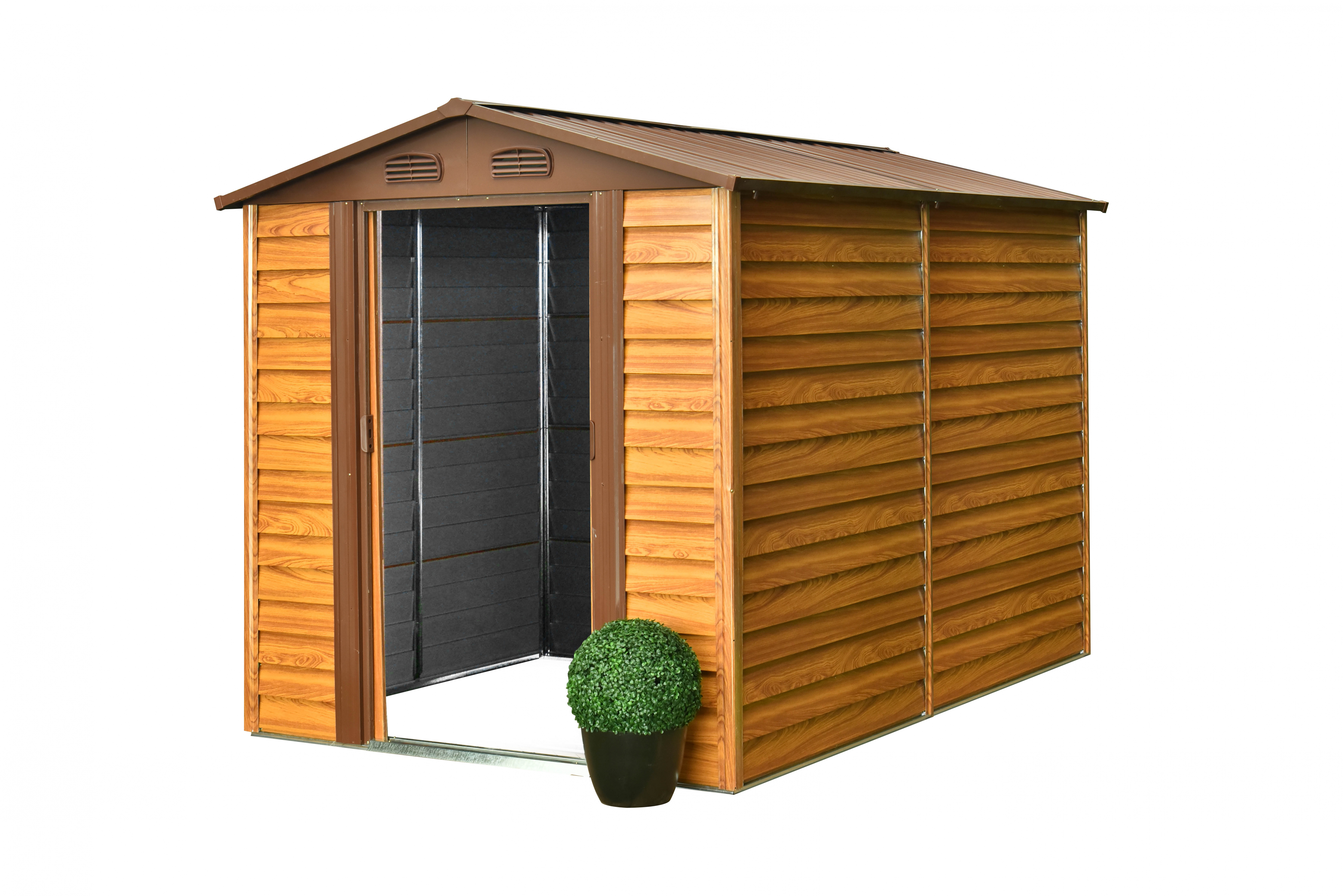 Stěny zahradního domku jsou vyrobeny z kvalitního profilovaného ocelového plechu tloušťky 0,25 mm s barevným nástřikem a konstrukce z galvanizovaného plechu o síle 0,60 mm.
