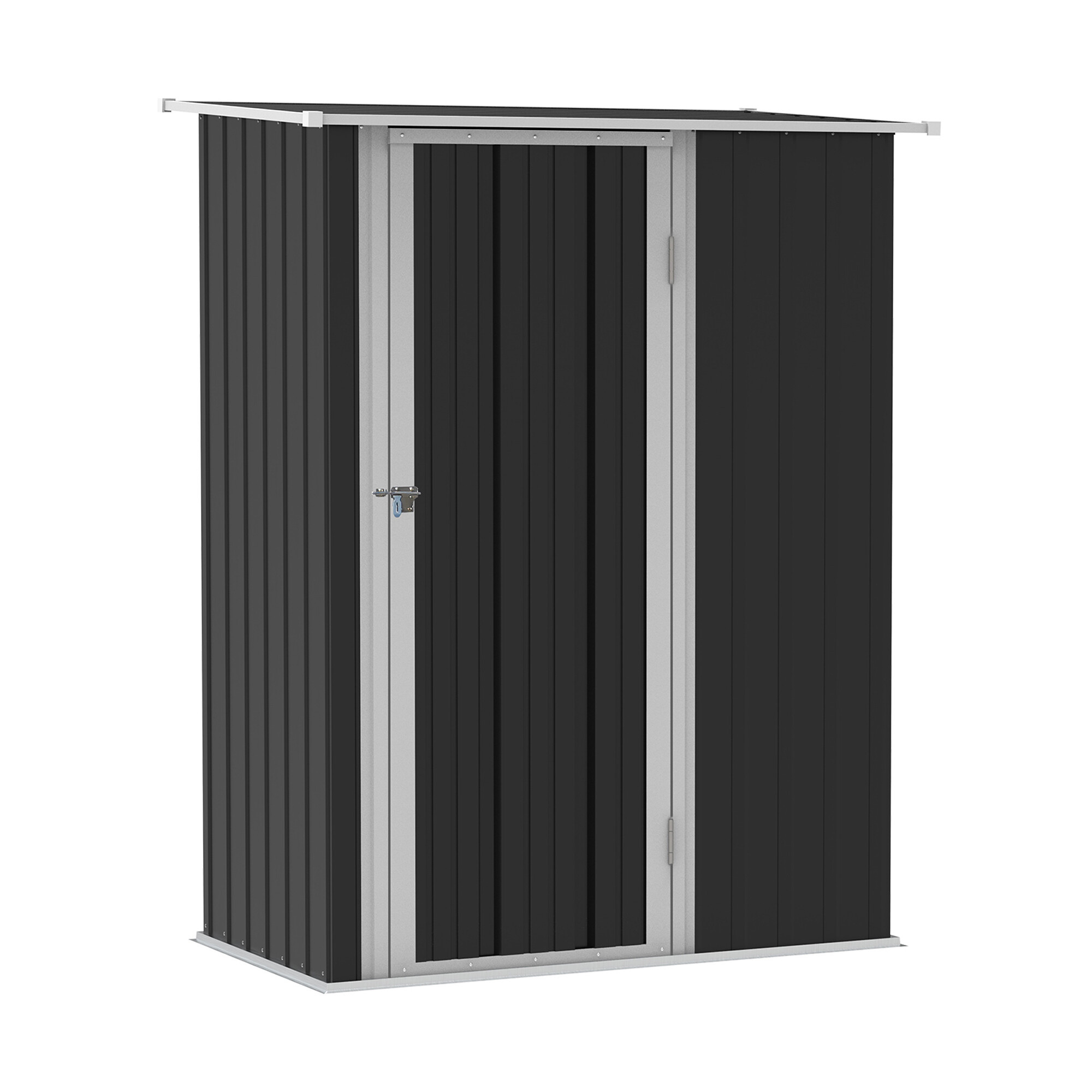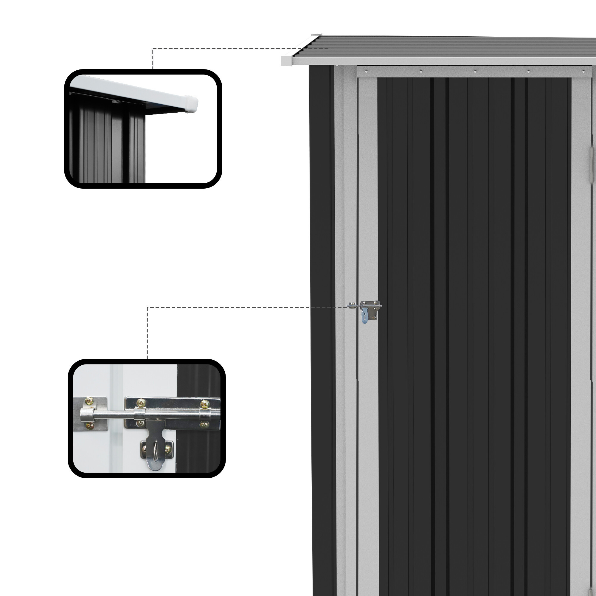 Zahradní domek má dveře o šířce 63 cm a výšce 171 cm. Součástí jsou i dveřní úchyty, díky kterým lze domek uzamknout běžným visacím zámkem.