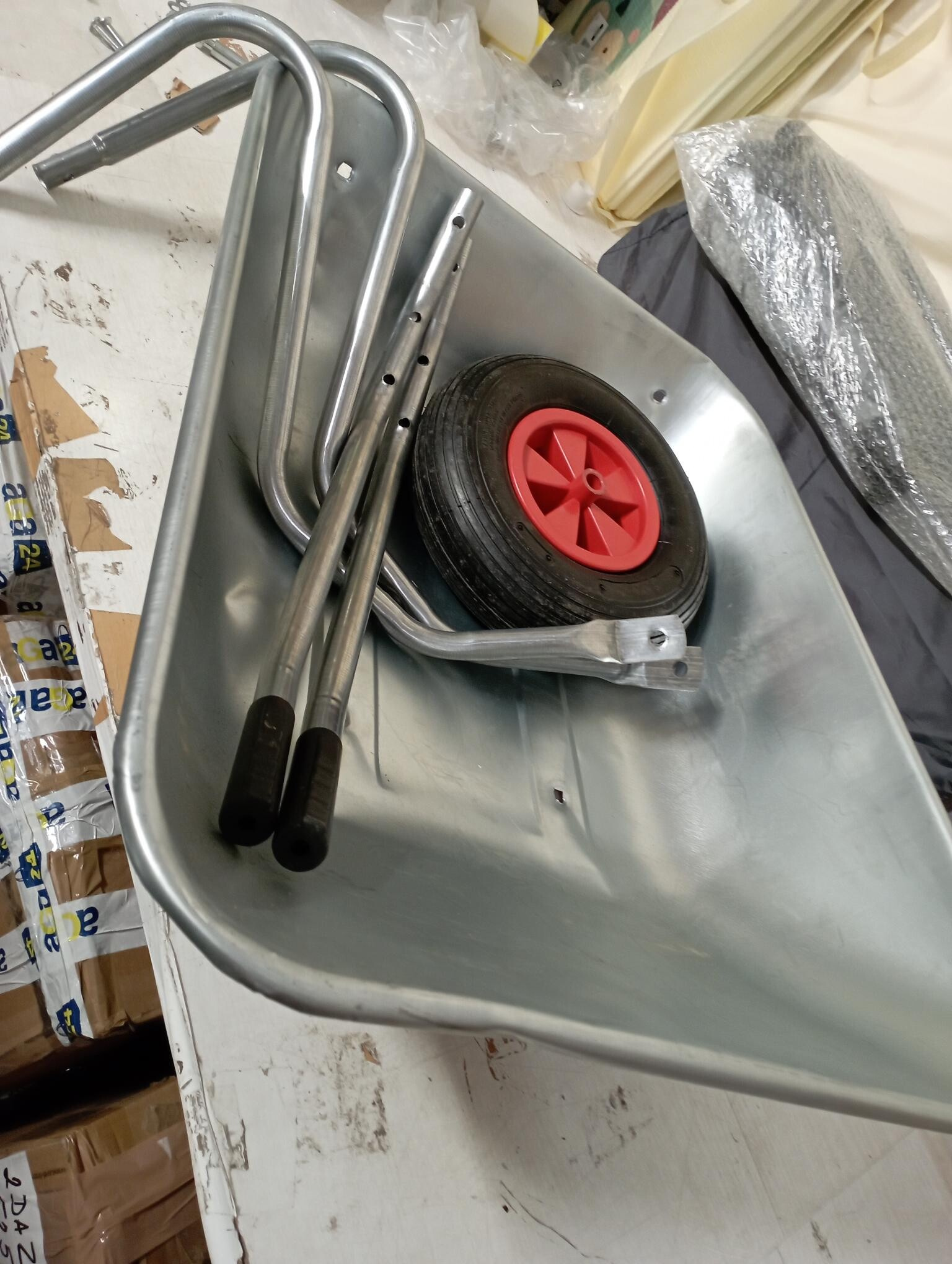 Kolečko je kompletní a plně funkční. Korba je mírně prohnutá, což je pouze vzhledová vada a nemá vliv na stabilitu ani využití při práci na zahradě.