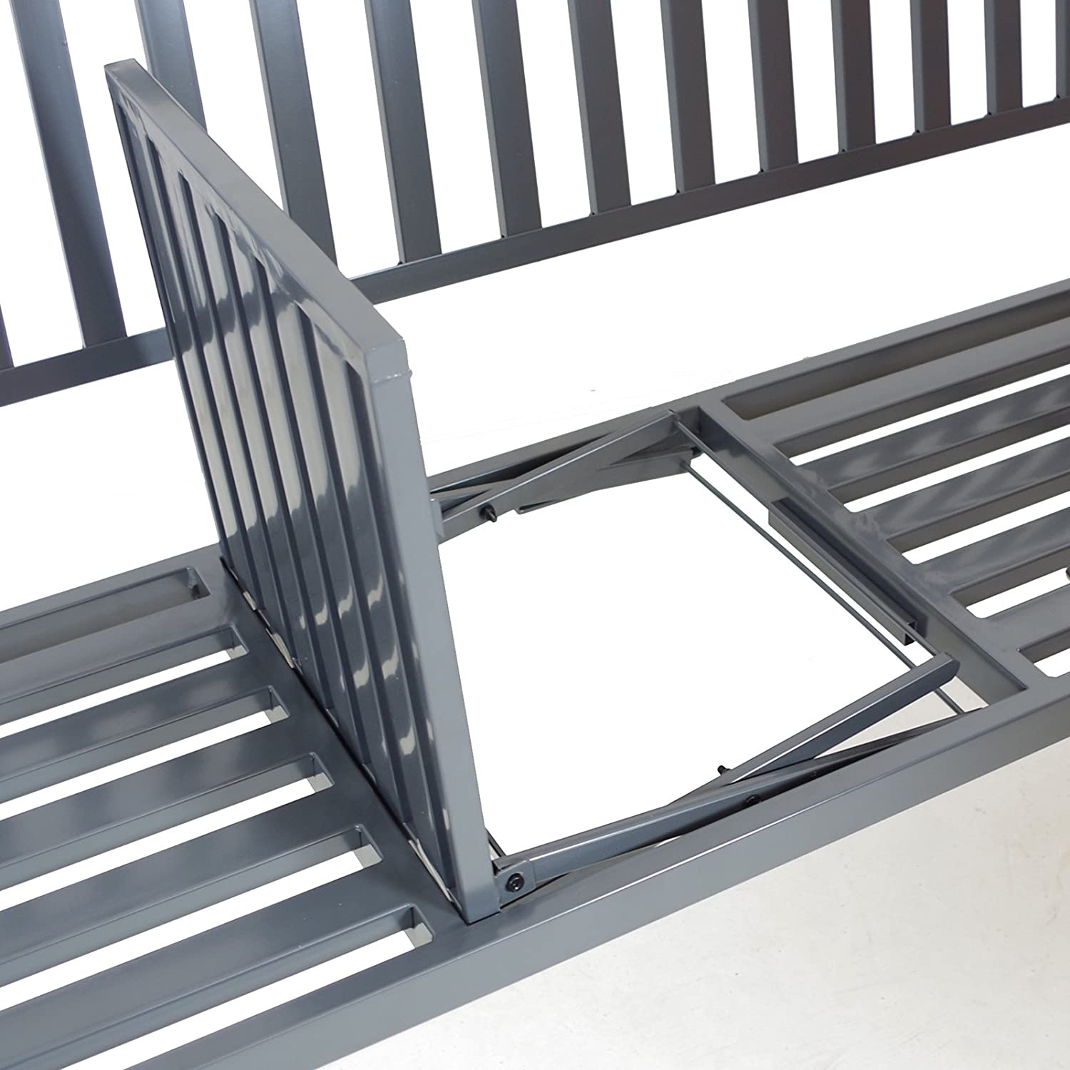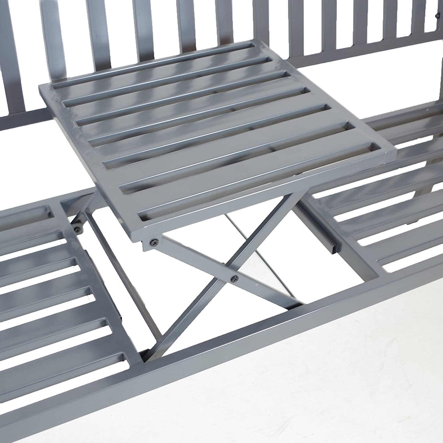 Už nikdy nebudete muset držet jídlo a pití v ruce, ale nyní je můžete pohodlně umístit na rozkládací stůl uprostřed této kovové lavice.