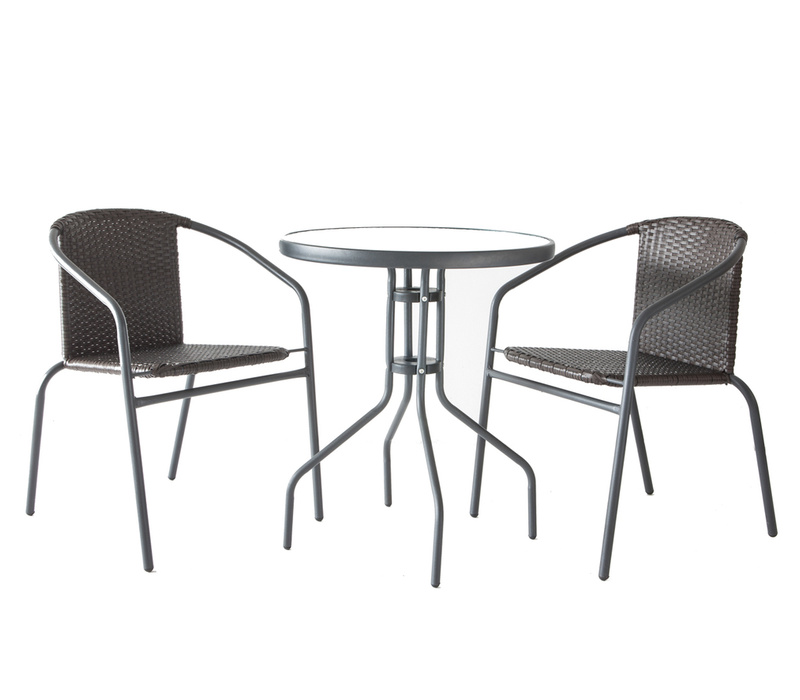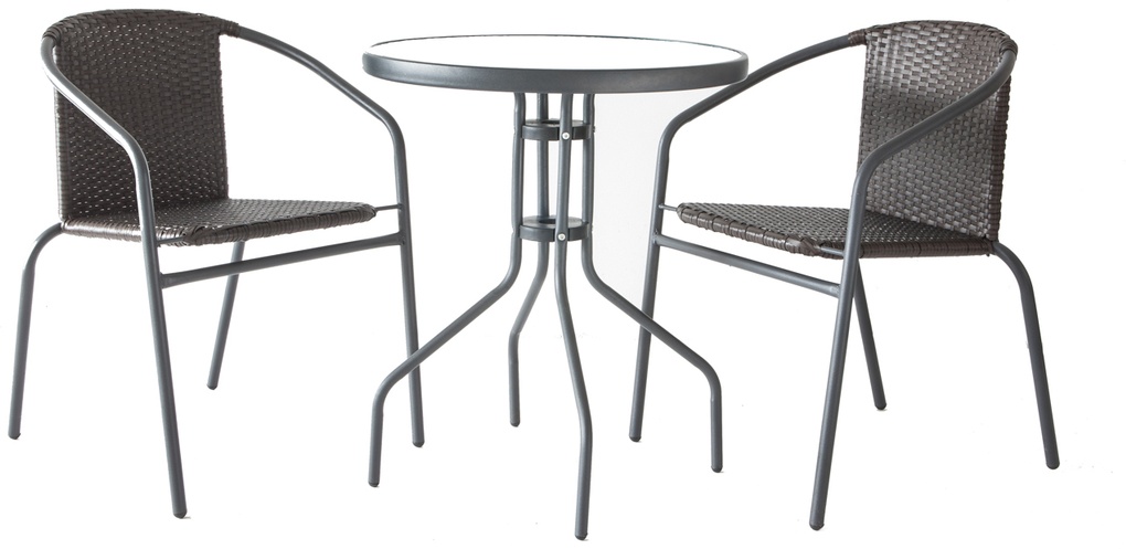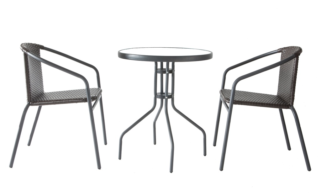 Sestava zahrnuje 2 ratanové křesla a stůl v barvě antracit se speciálním sklem.