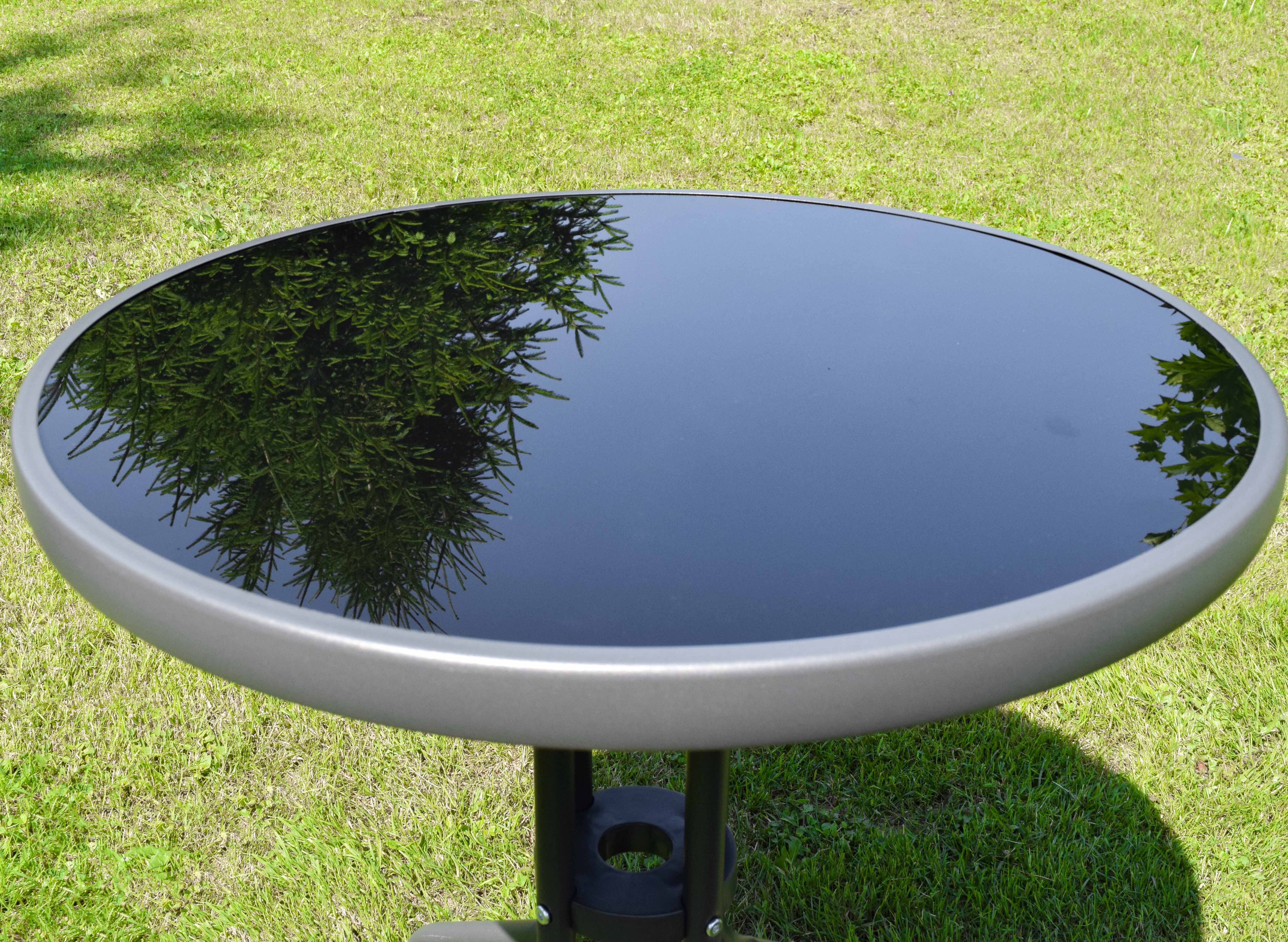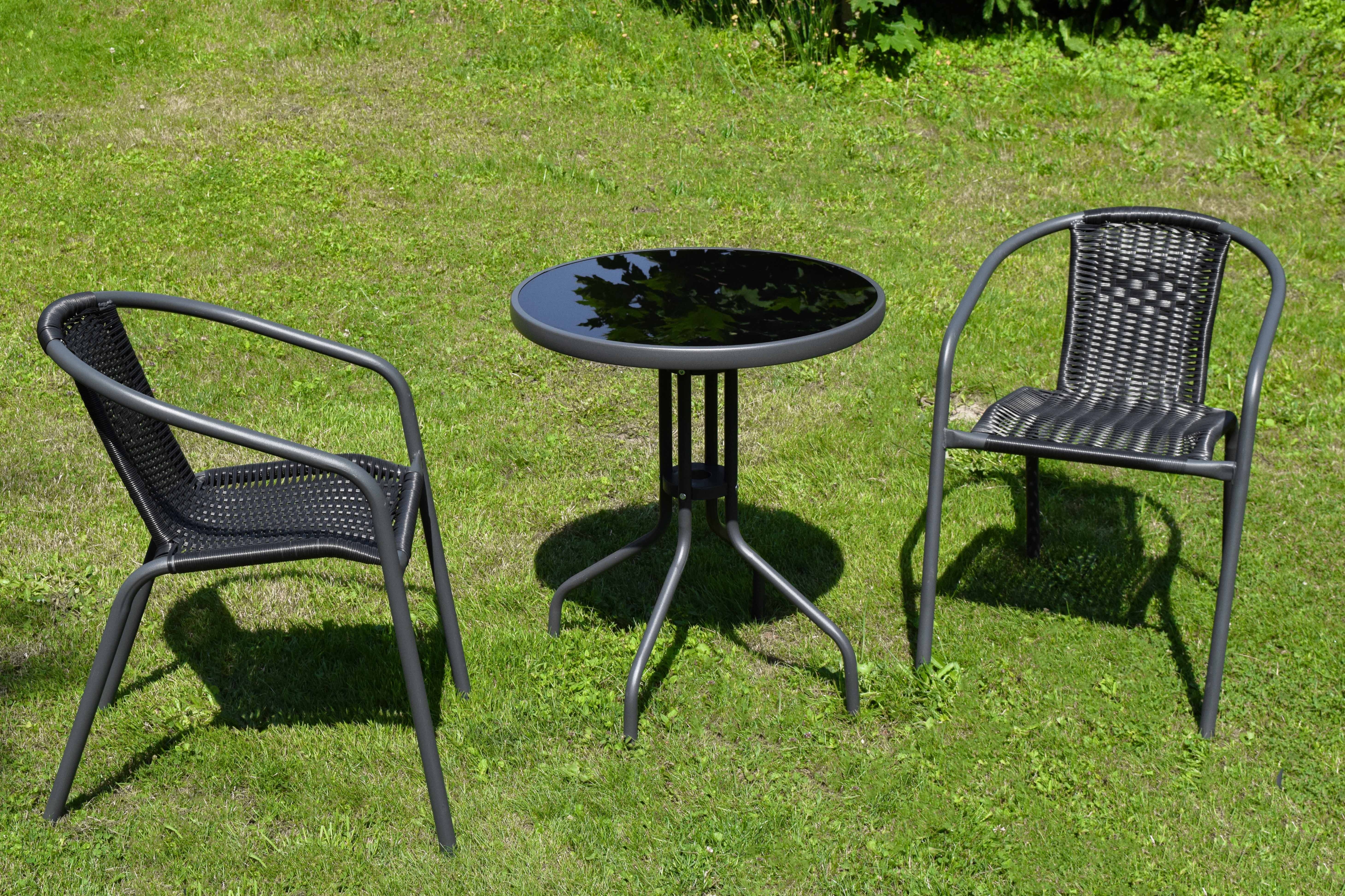 Stolní sklo je tvrzené, židle z polyratanu a ocelová konstrukce vyrobena z materiálu vysoké kvality.