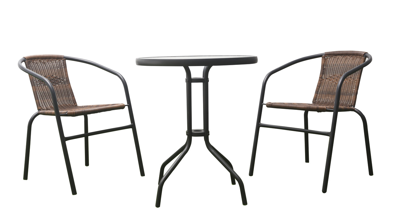 Velmi praktická a elegantní zahradní sestava TERRACE zahrnuje dvě křesla vyrobená z polyratanu a stolek se speciálním tvrzeným sklem.