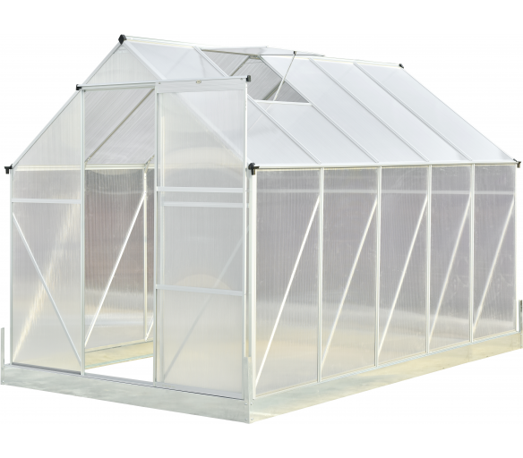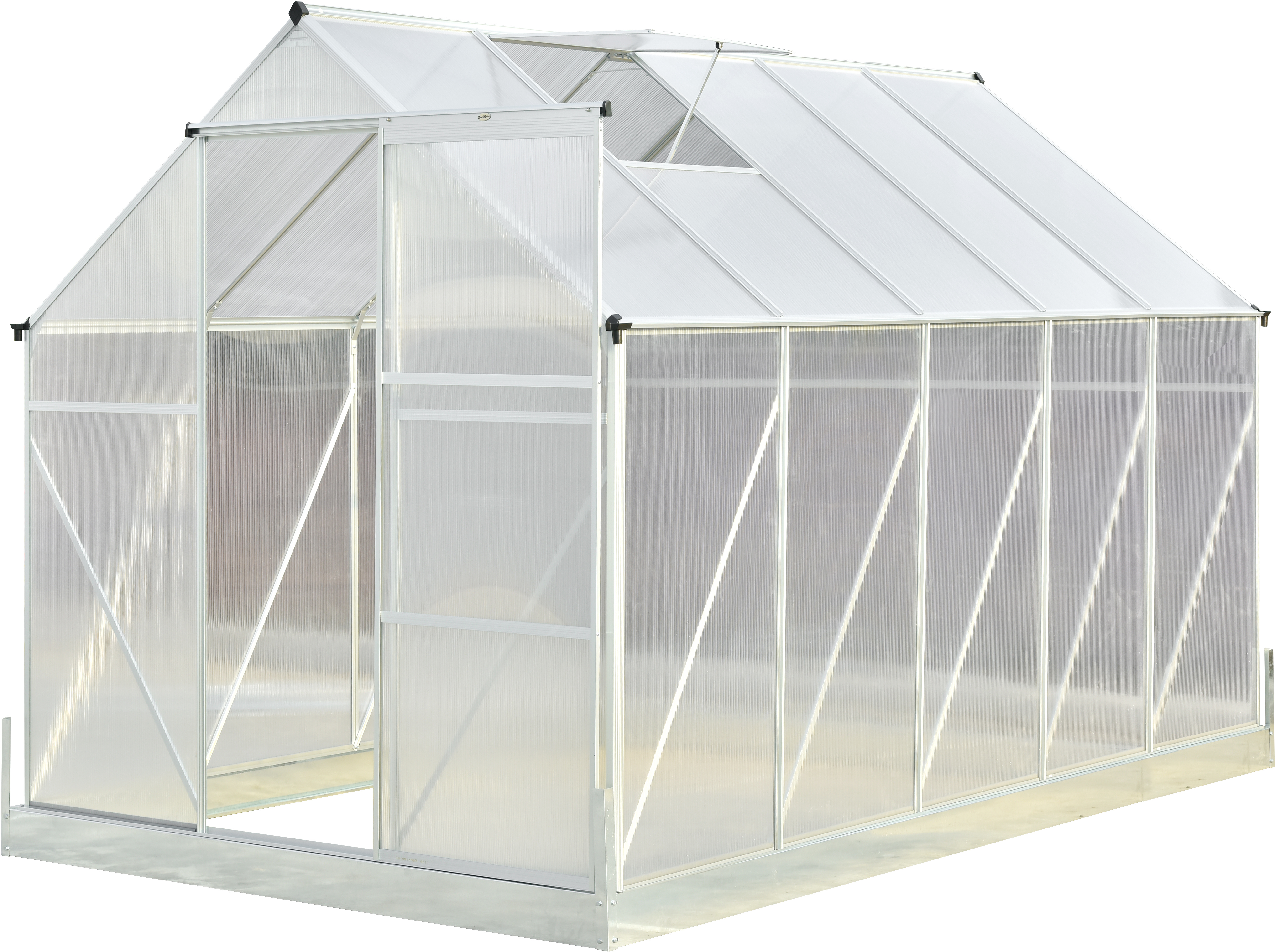 Skleník má velké posuvné dveře pro snadný přístup. Střechu doplňují ventilační okna pro zajištění cirkulace vzduchu.