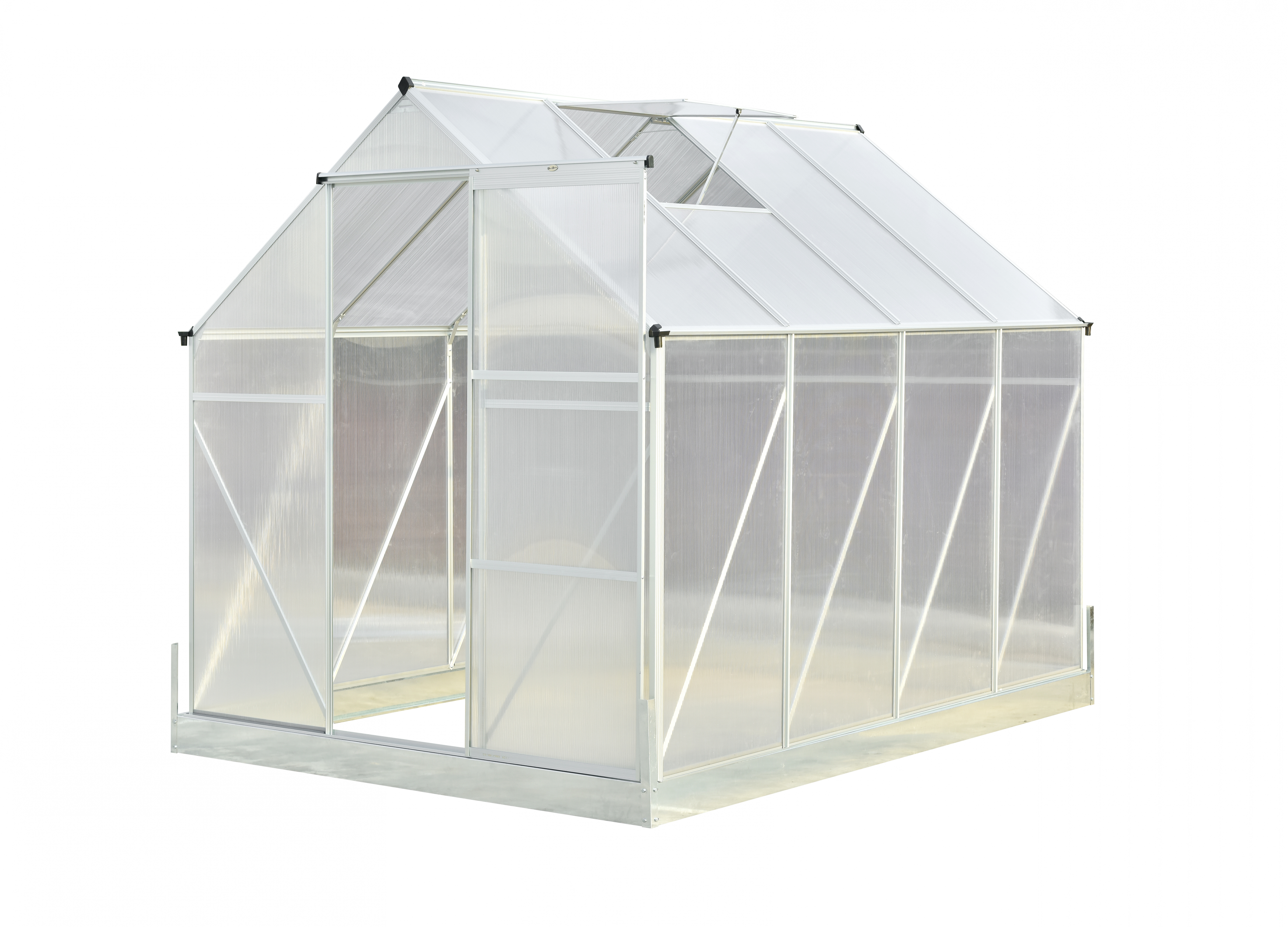Skleník má velké posuvné dveře pro snadný přístup. Střechu doplňují ventilační okna pro zajištění cirkulace vzduchu.