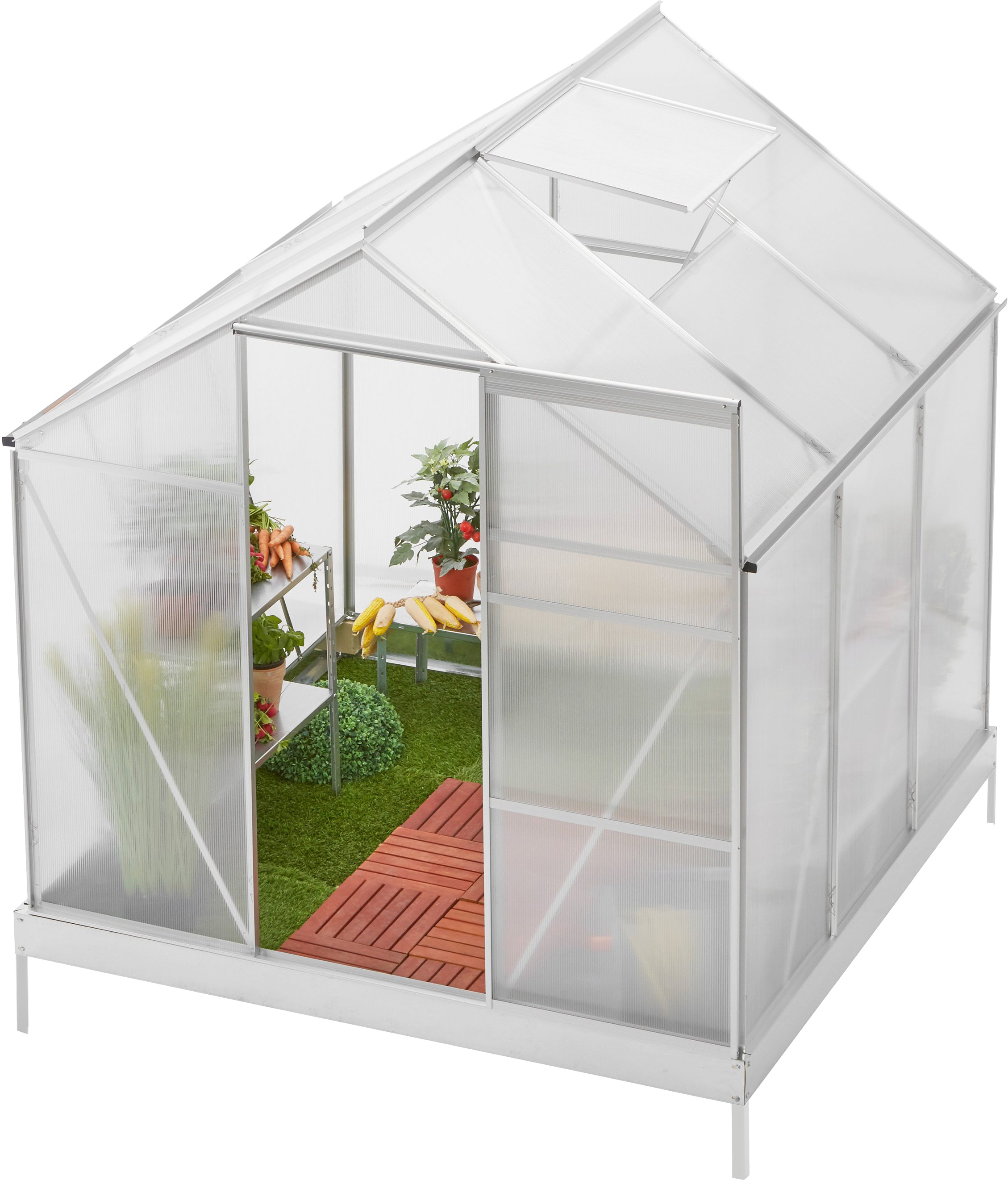 Skleník má velké posuvné dveře pro snadný přístup. Střechu doplňuje ventilační okno pro zajištění cirkulace vzduchu.