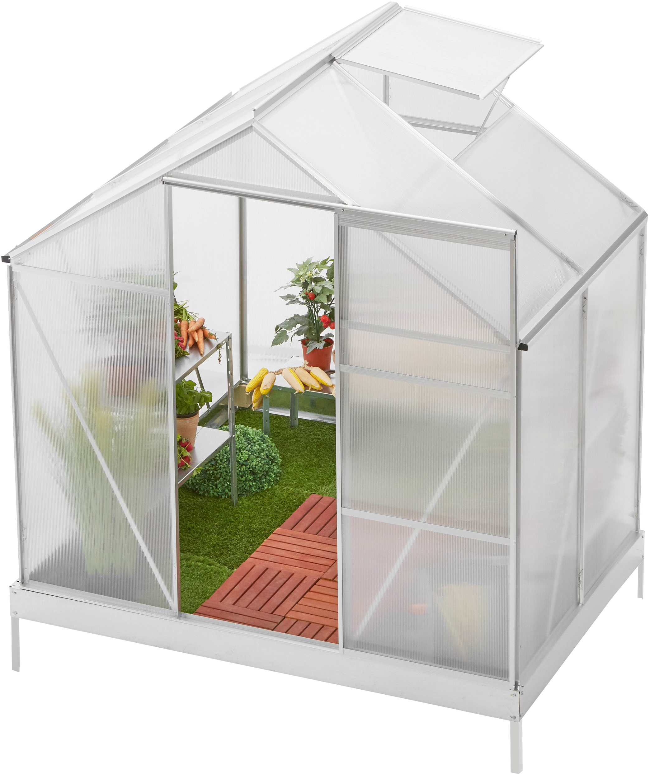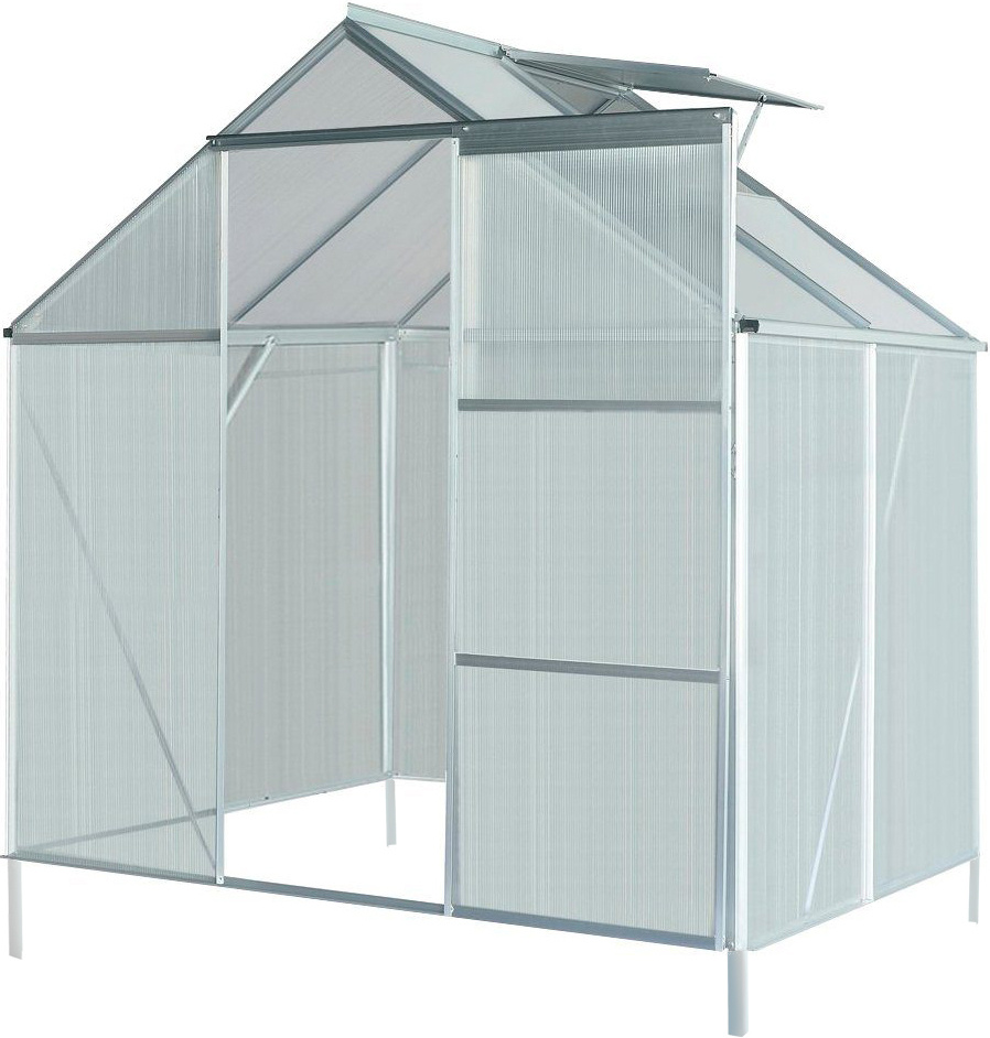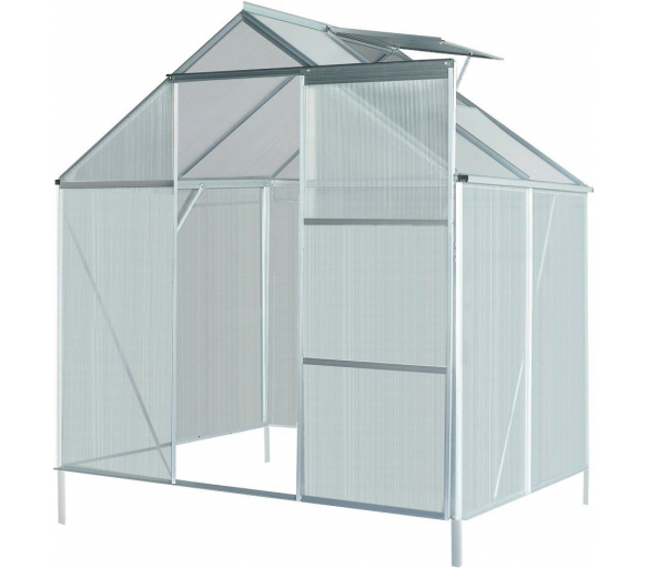Skleník má velké posuvné dveře pro snadný přístup. Střechu doplňuje ventilační okno pro zajištění cirkulace vzduchu.