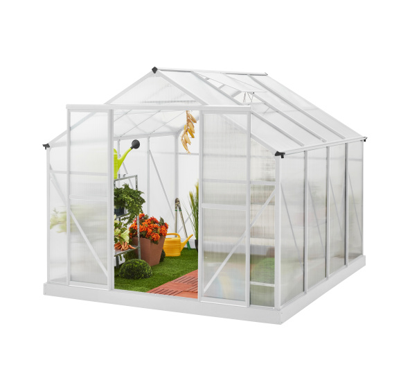 Skleník má velké posuvné dveře pro snadný přístup. Střechu doplňují ventilační okna pro zajištění cirkulace vzduchu.