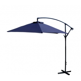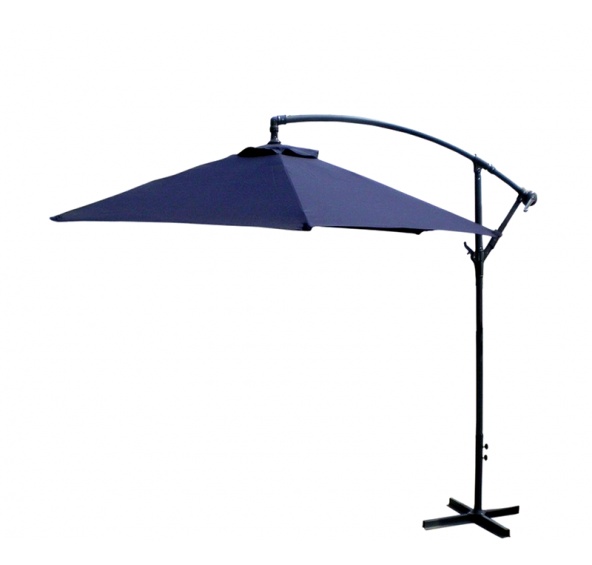 Praktický zahradní slunečník vyrobený z odolného polyesteru, jehož noha je umístěna mimo stíněnou plochu.
