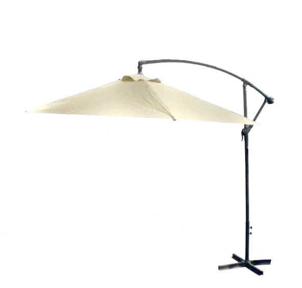 Praktický zahradní slunečník vyrobený z odolného polyesteru, jehož noha je umístěna mimo stíněnou plochu.