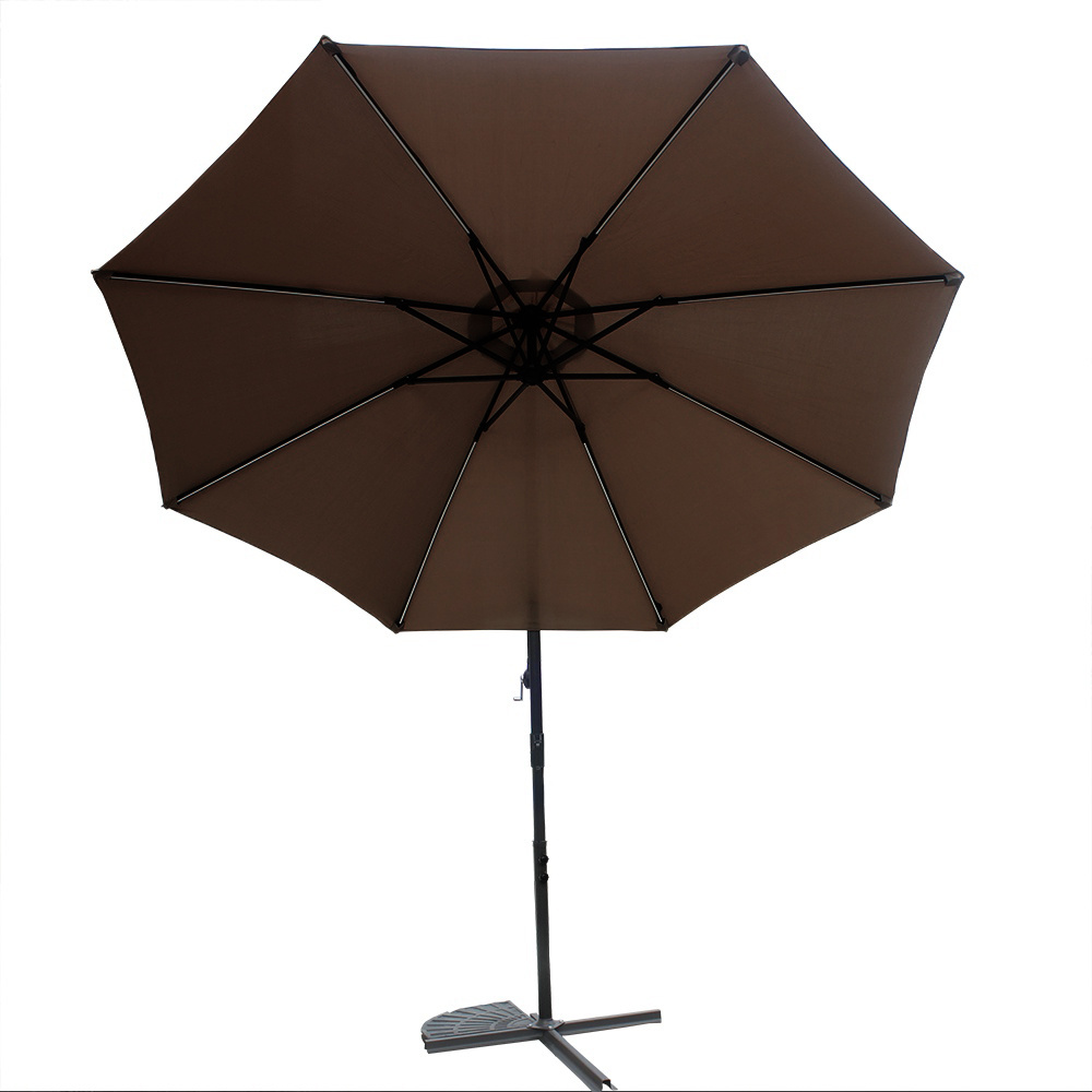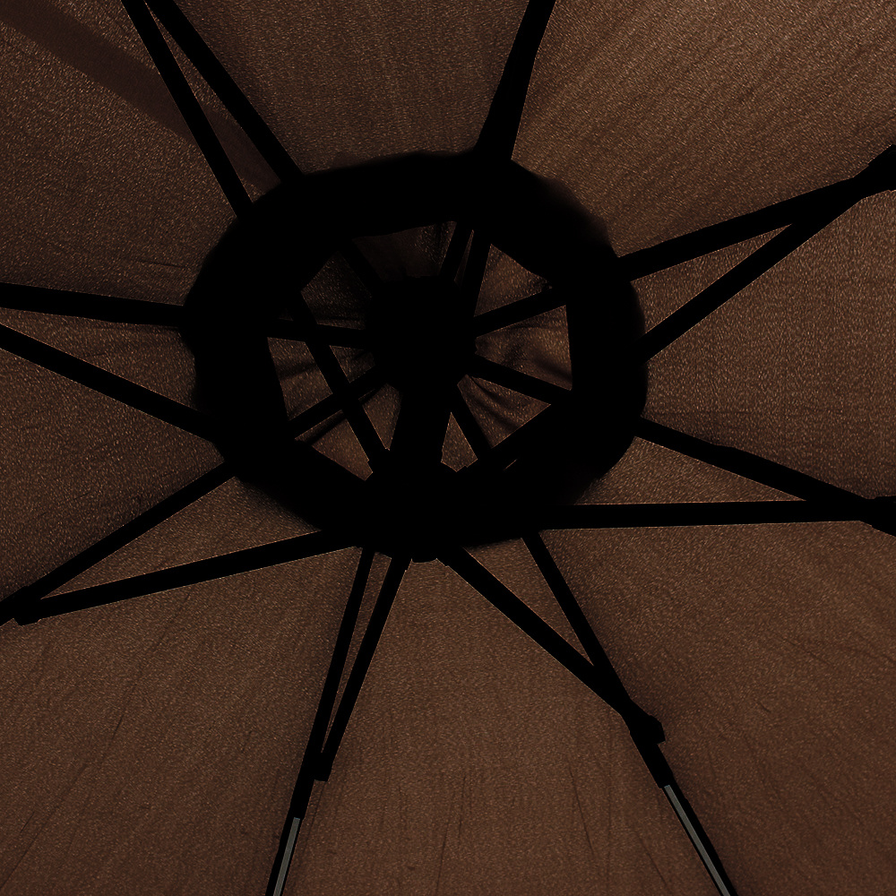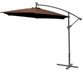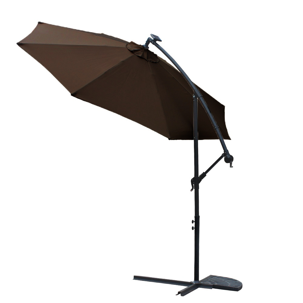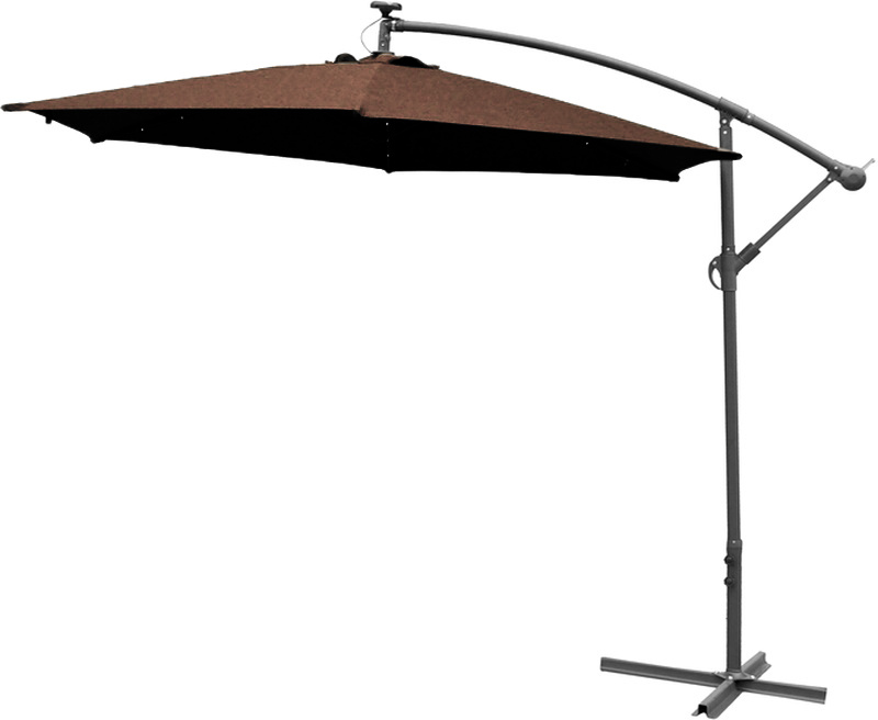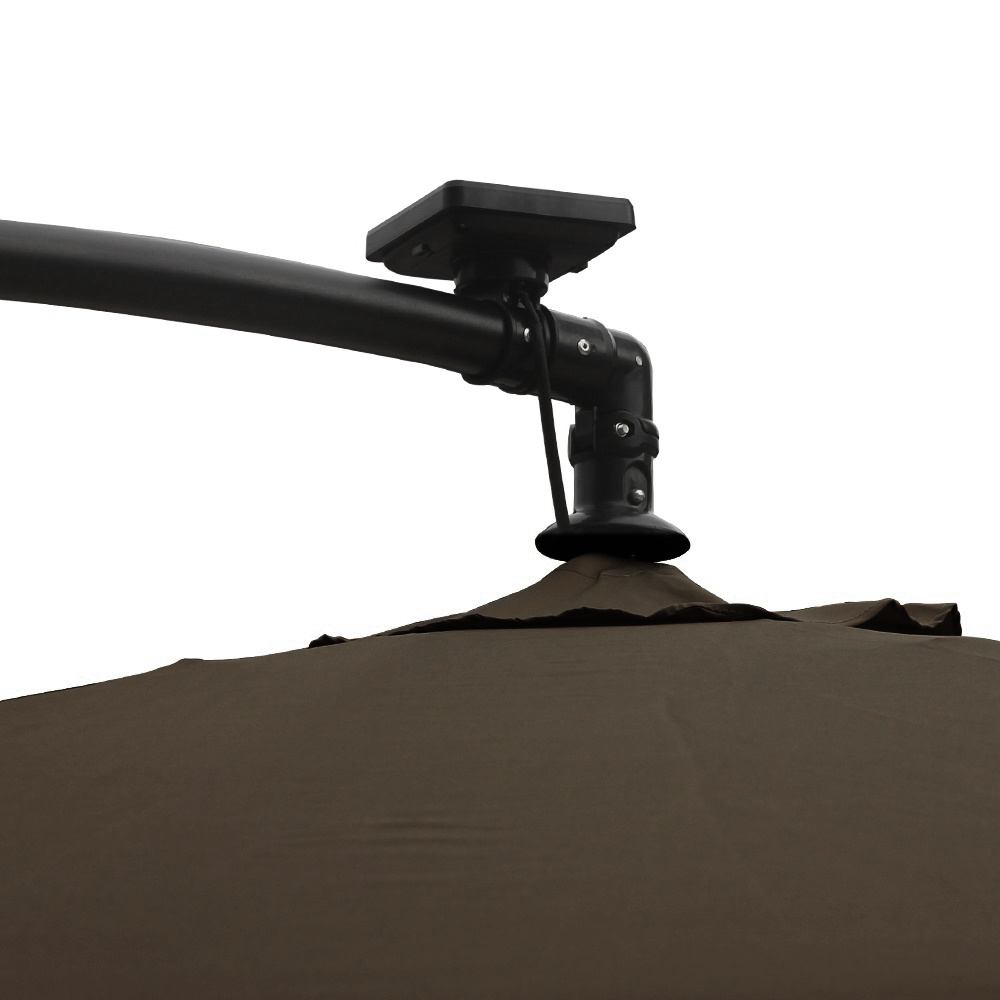 Praktický zahradní konzolový slunečník s LED podsvícením, vyrobený z odolného polyesteru, jehož noha je umístěna mimo stíněnou plochu.