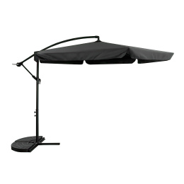 Praktický zahradní slunečník vyrobený z odolného polyesteru, jehož noha je umístěna mimo stíněnou plochu.