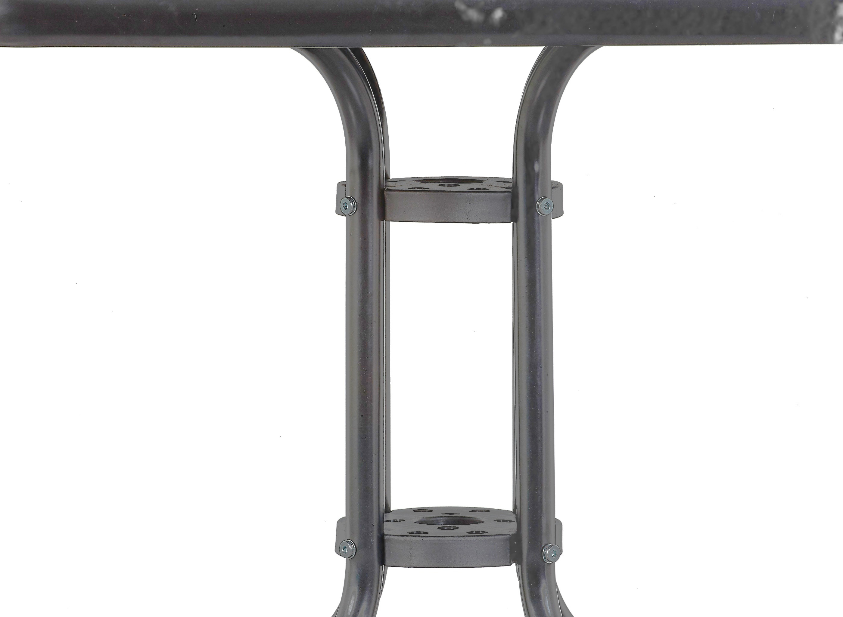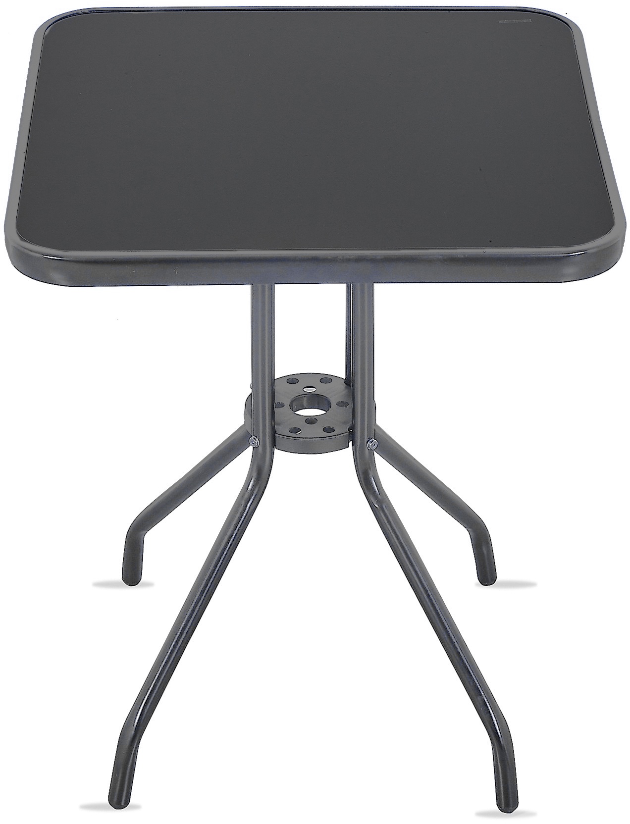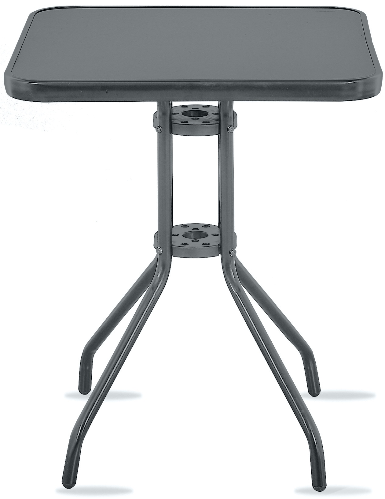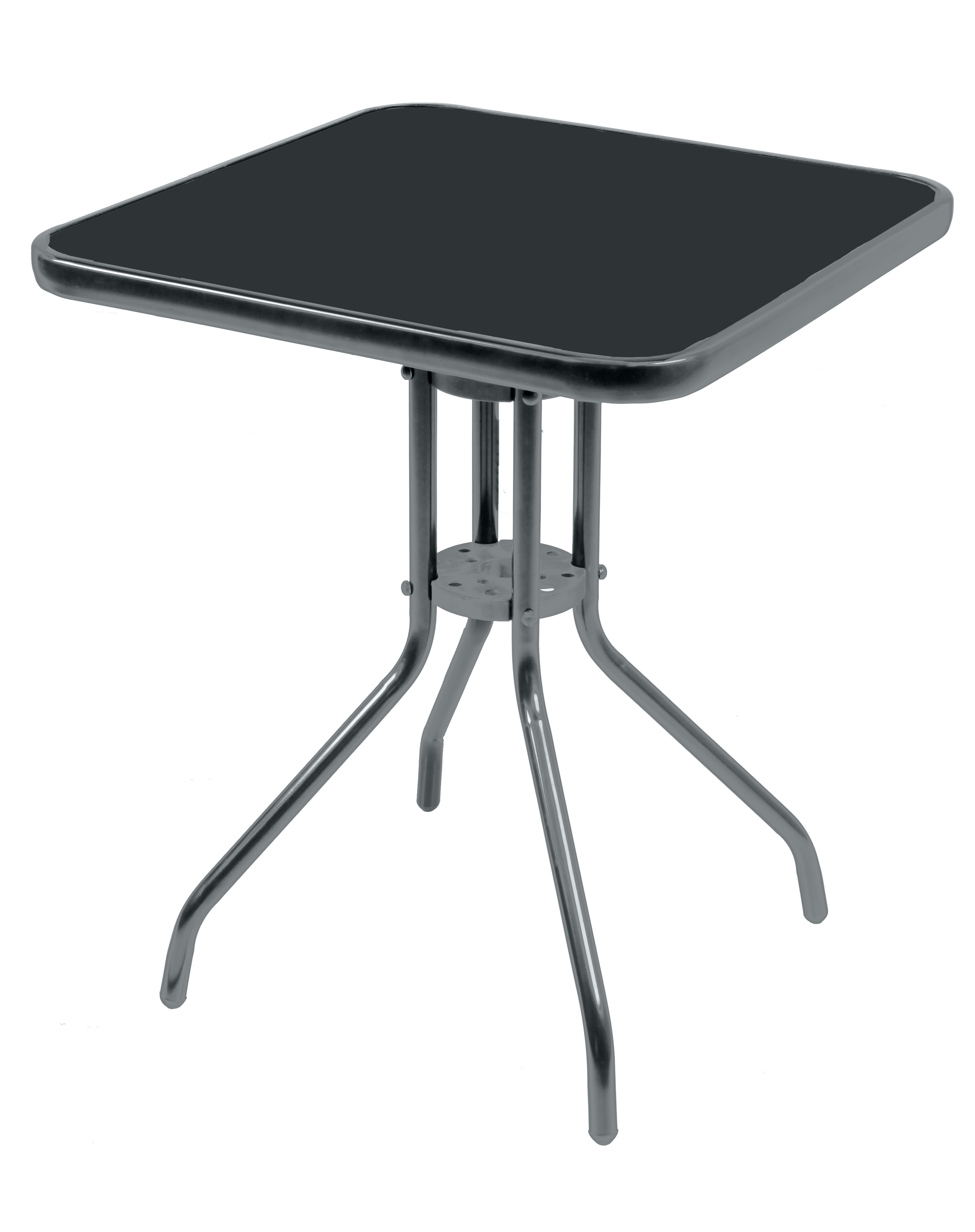 Zahradní stůl s pevným kovovým rámem a skleněnou deskou, vhodný pro zahrady, terasy, kavárny, altánky, balkóny.