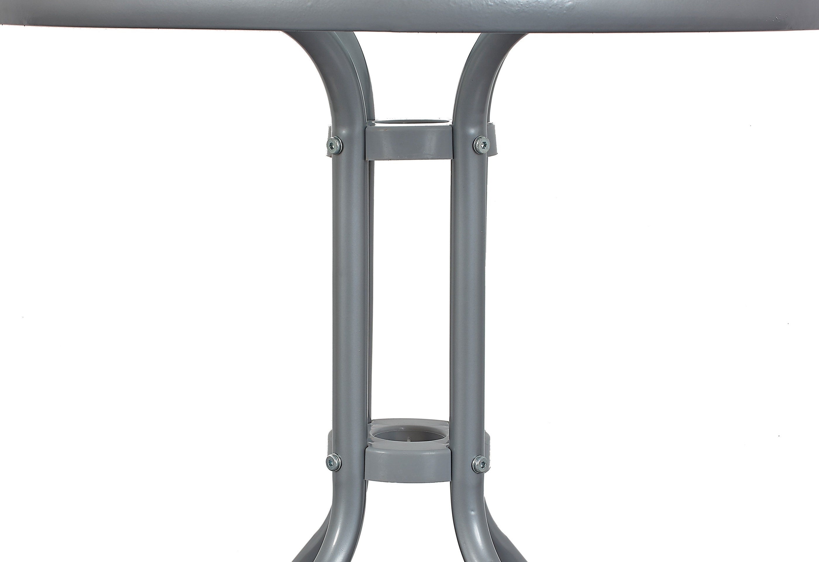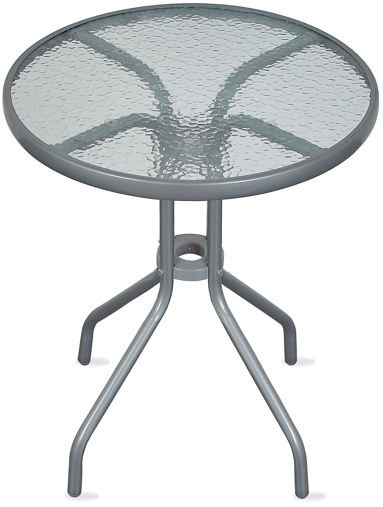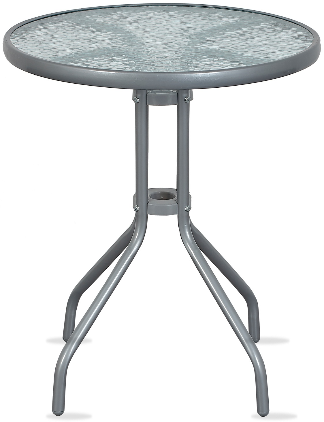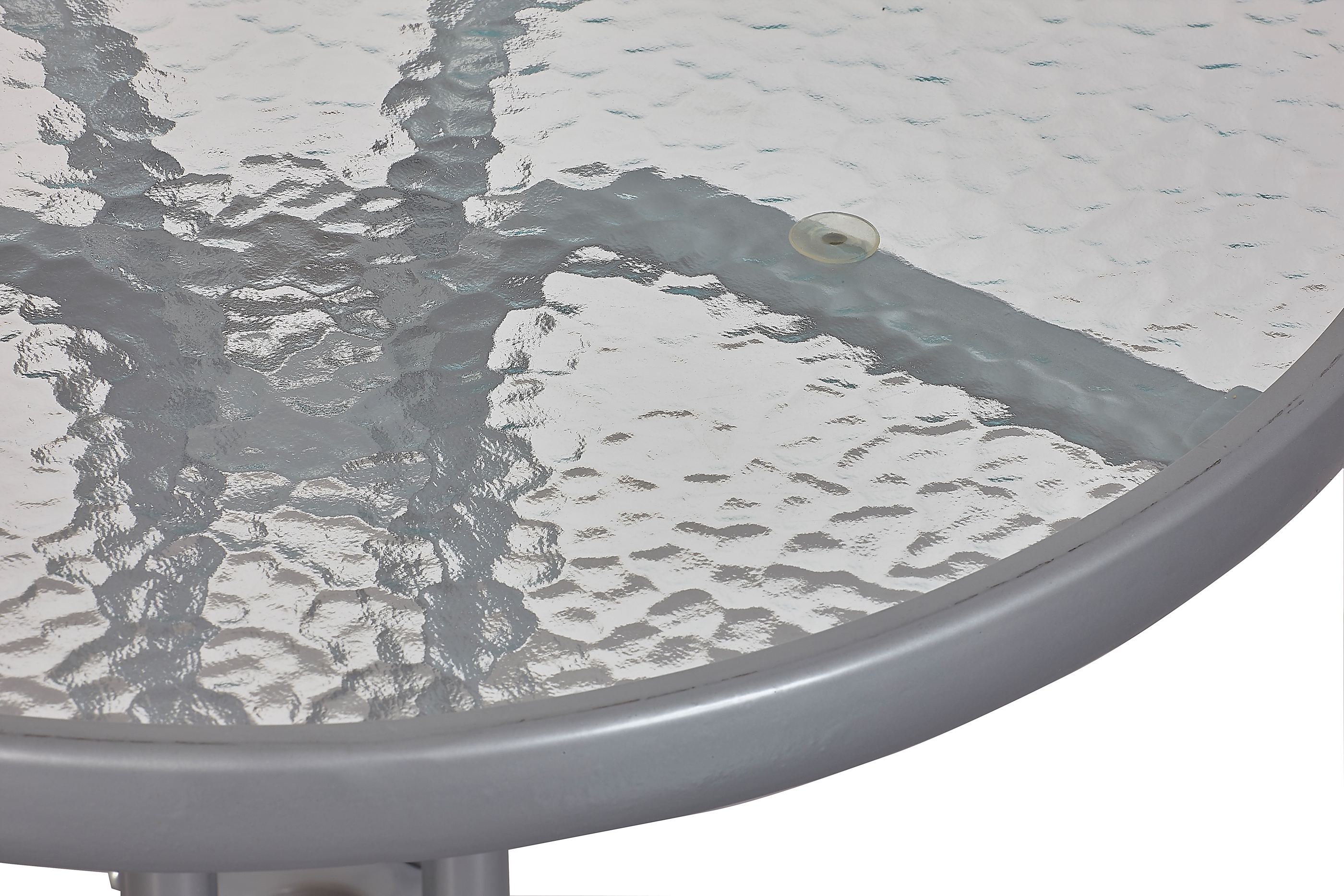 Kulatý zahradní stůl s pevným kovovým rámem a texturovanou skleněnou deskou, vhodný pro zahrady, terasy, kavárny, altánky, balkóny.