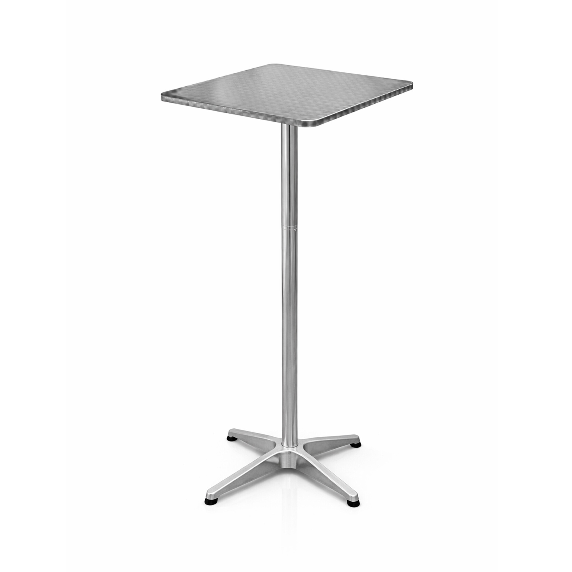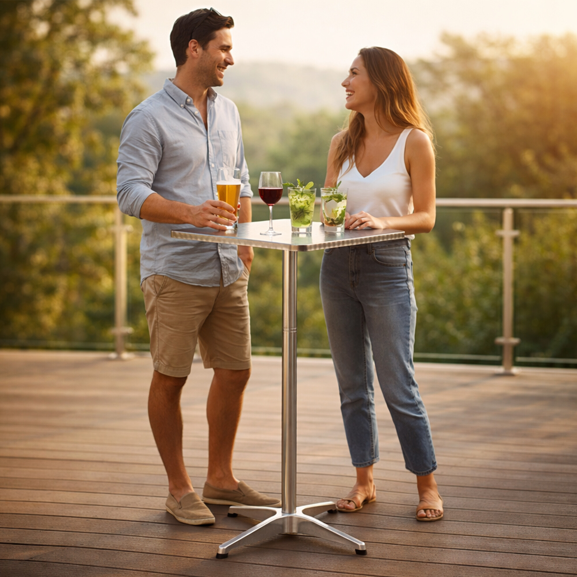 Zahradní stůl BISTRO s pevným hliníkovým rámem a nerezovou deskou v moderním designu, vhodný pro zahrady, terasy, kavárny, altánky, balkóny či pláže.
