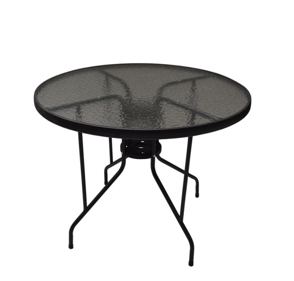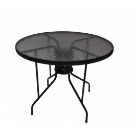 Kulatý zahradní stůl DIA s pevným kovovým rámem a texturovanou skleněnou deskou v moderním designu, vhodný pro zahrady, terasy, kavárny, altánky, balkóny či pláže.