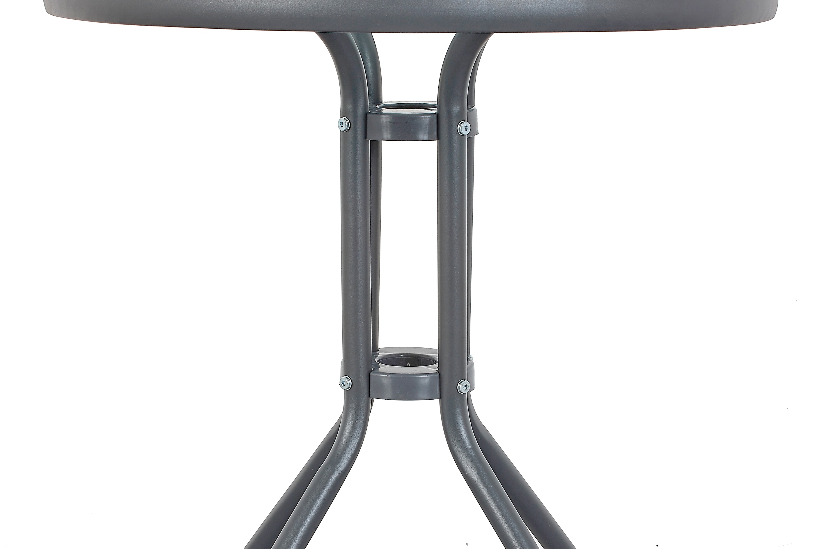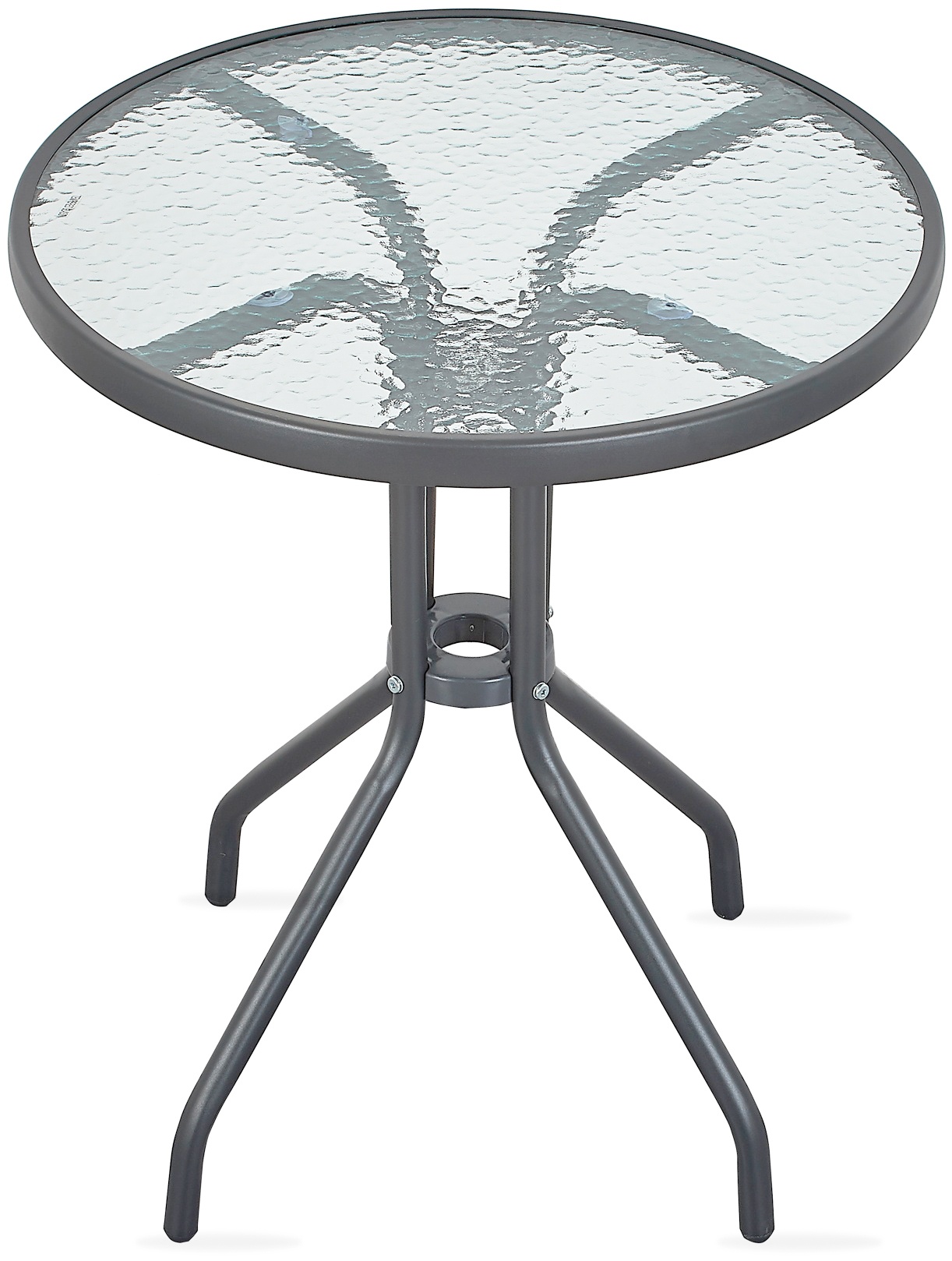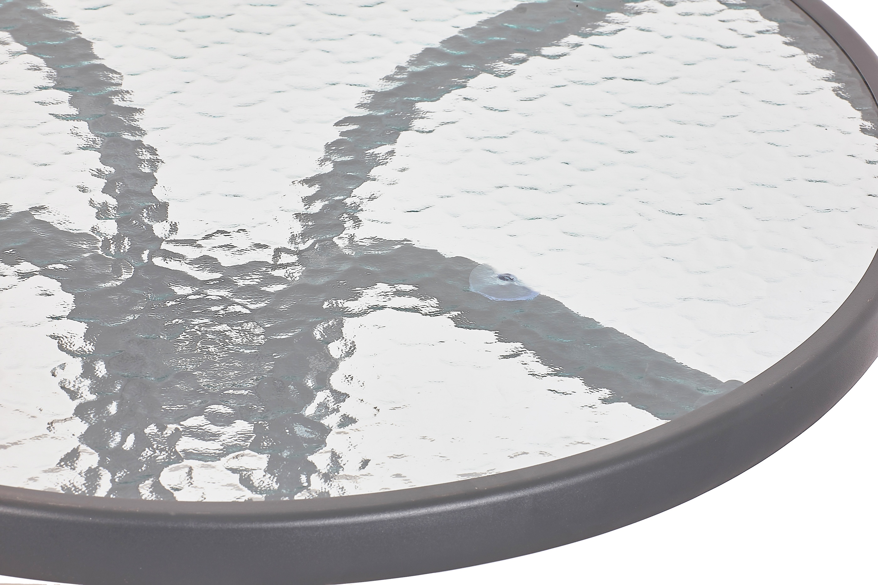 Kulatý zahradní stůl s pevným kovovým rámem a texturovanou skleněnou deskou, vhodný pro zahrady, terasy, kavárny, altánky, balkóny.
