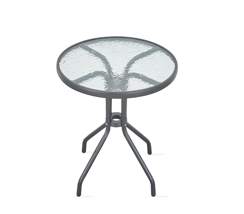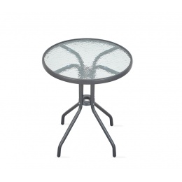 Kulatý zahradní stůl s pevným kovovým rámem a texturovanou skleněnou deskou, vhodný pro zahrady, terasy, kavárny, altánky, balkóny.