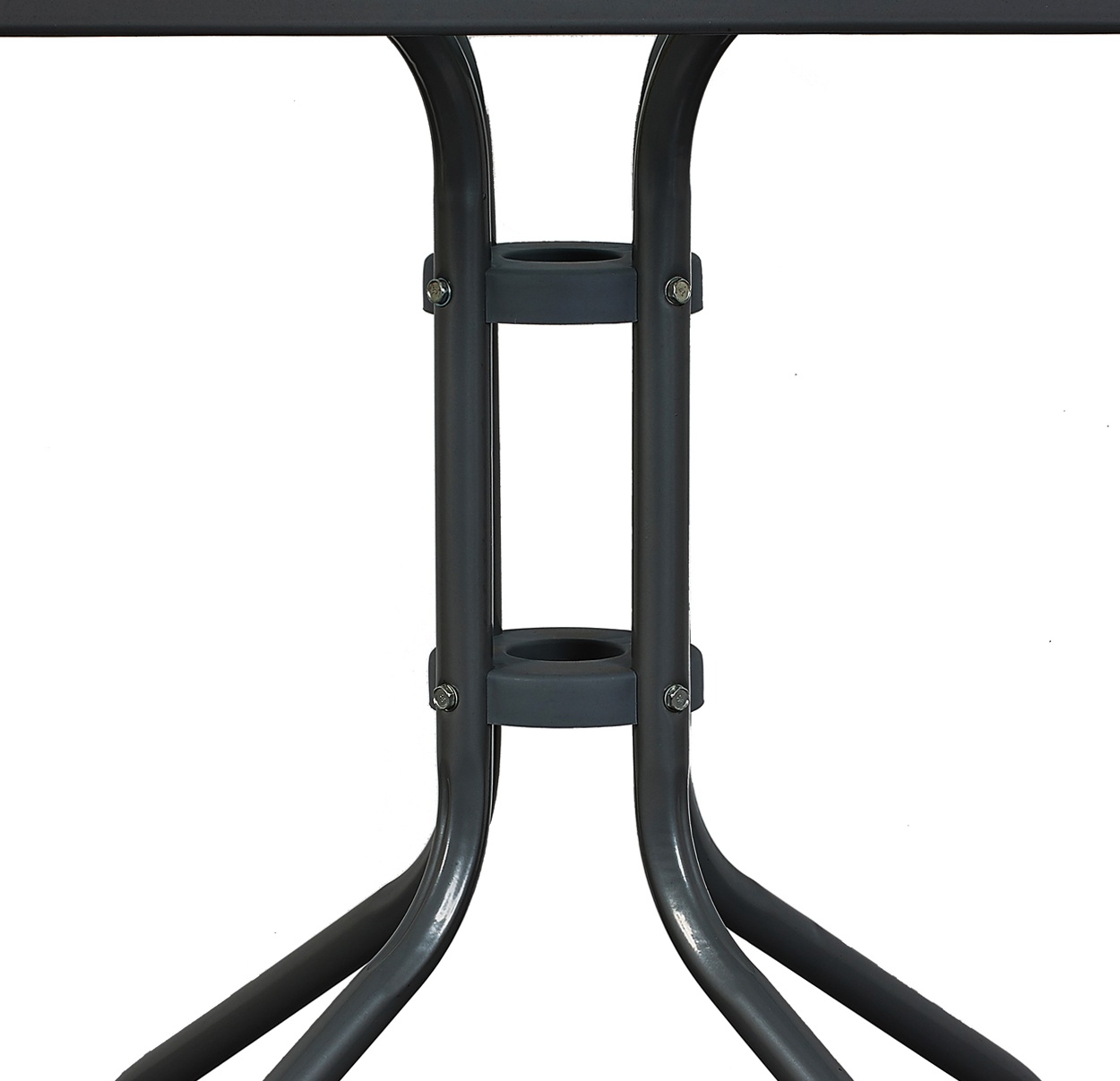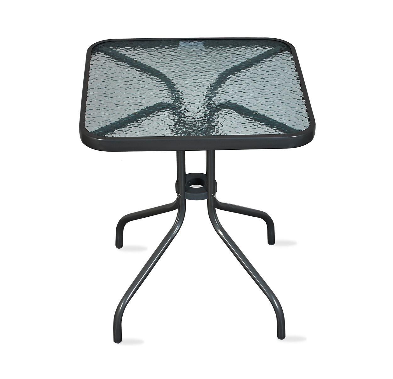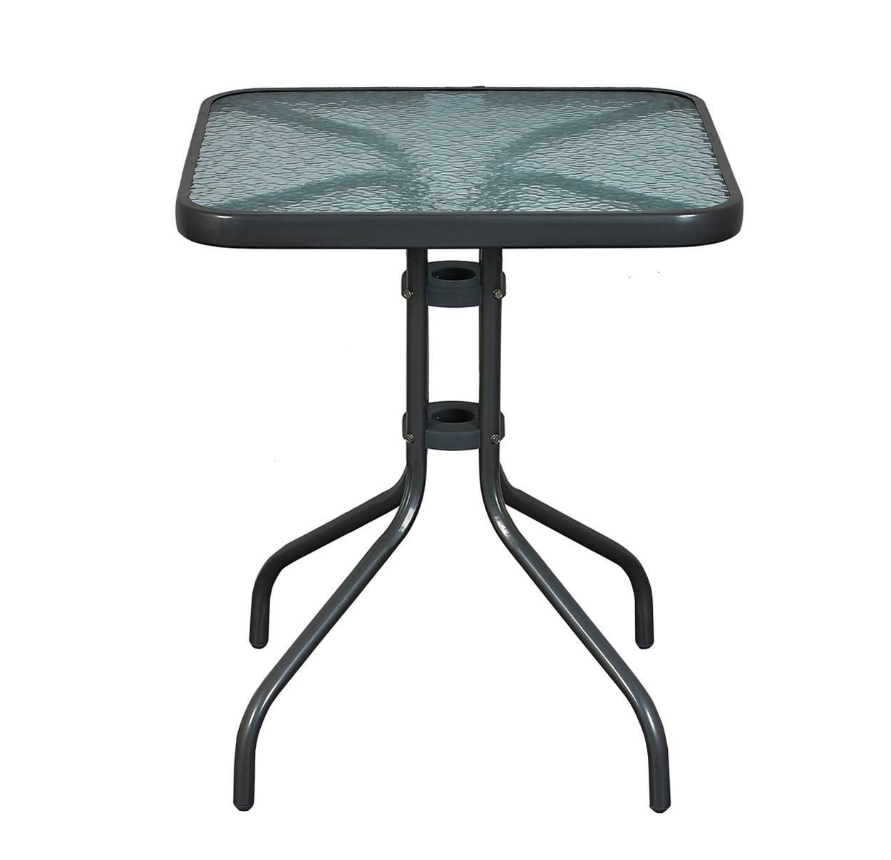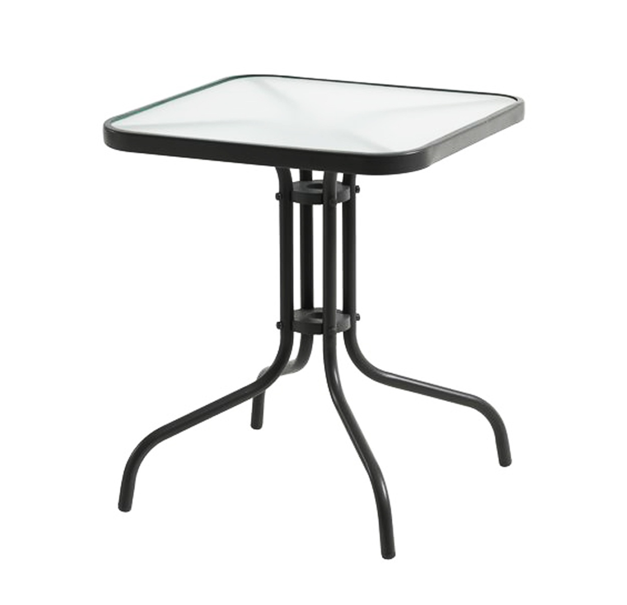 Zahradní stůl s pevným kovovým rámem a skleněnou deskou, vhodný pro zahrady, terasy, kavárny, altánky, balkóny.