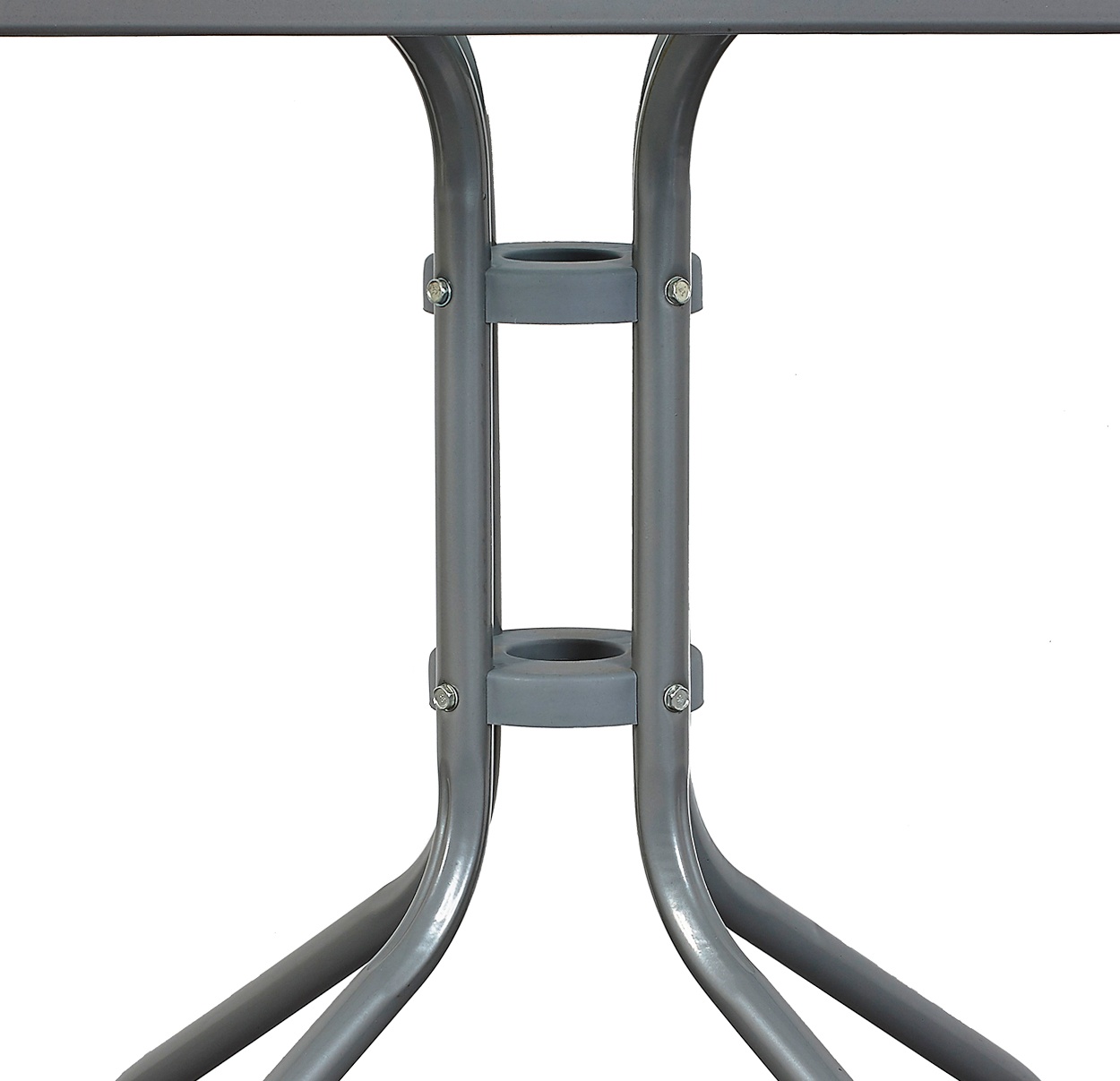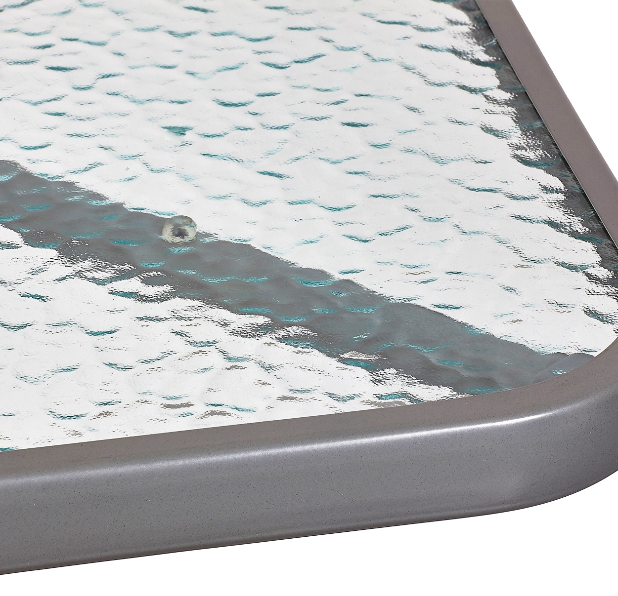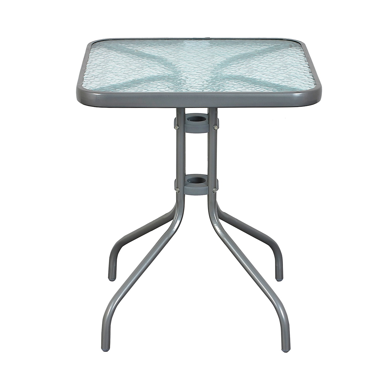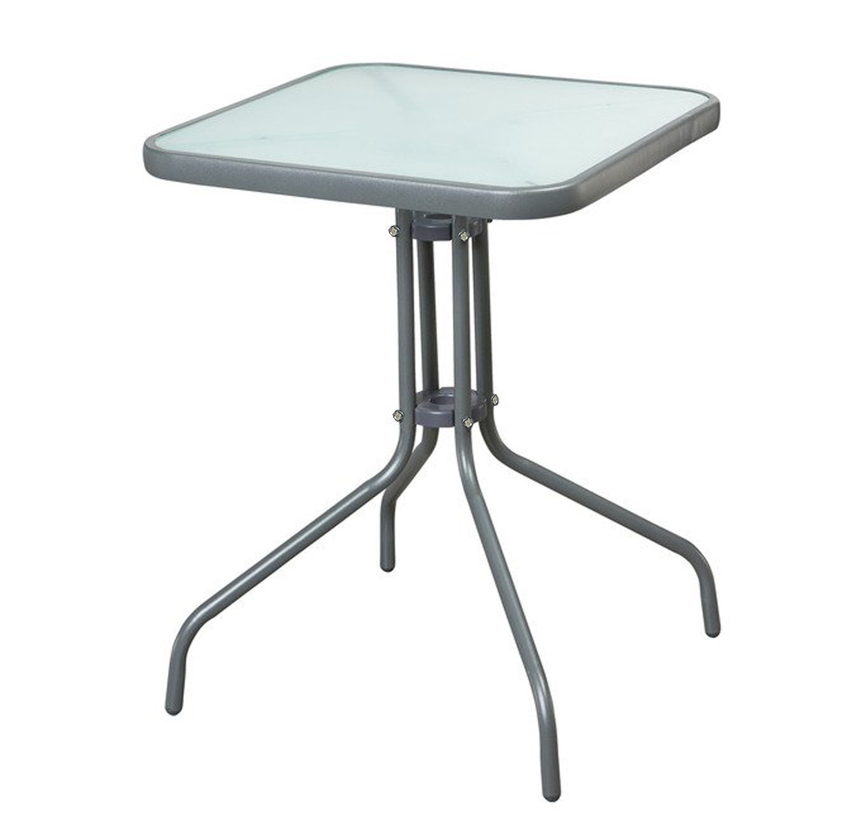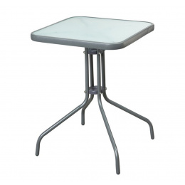 Zahradní stůl s pevným kovovým rámem a skleněnou deskou, vhodný pro zahrady, terasy, kavárny, altánky, balkóny.